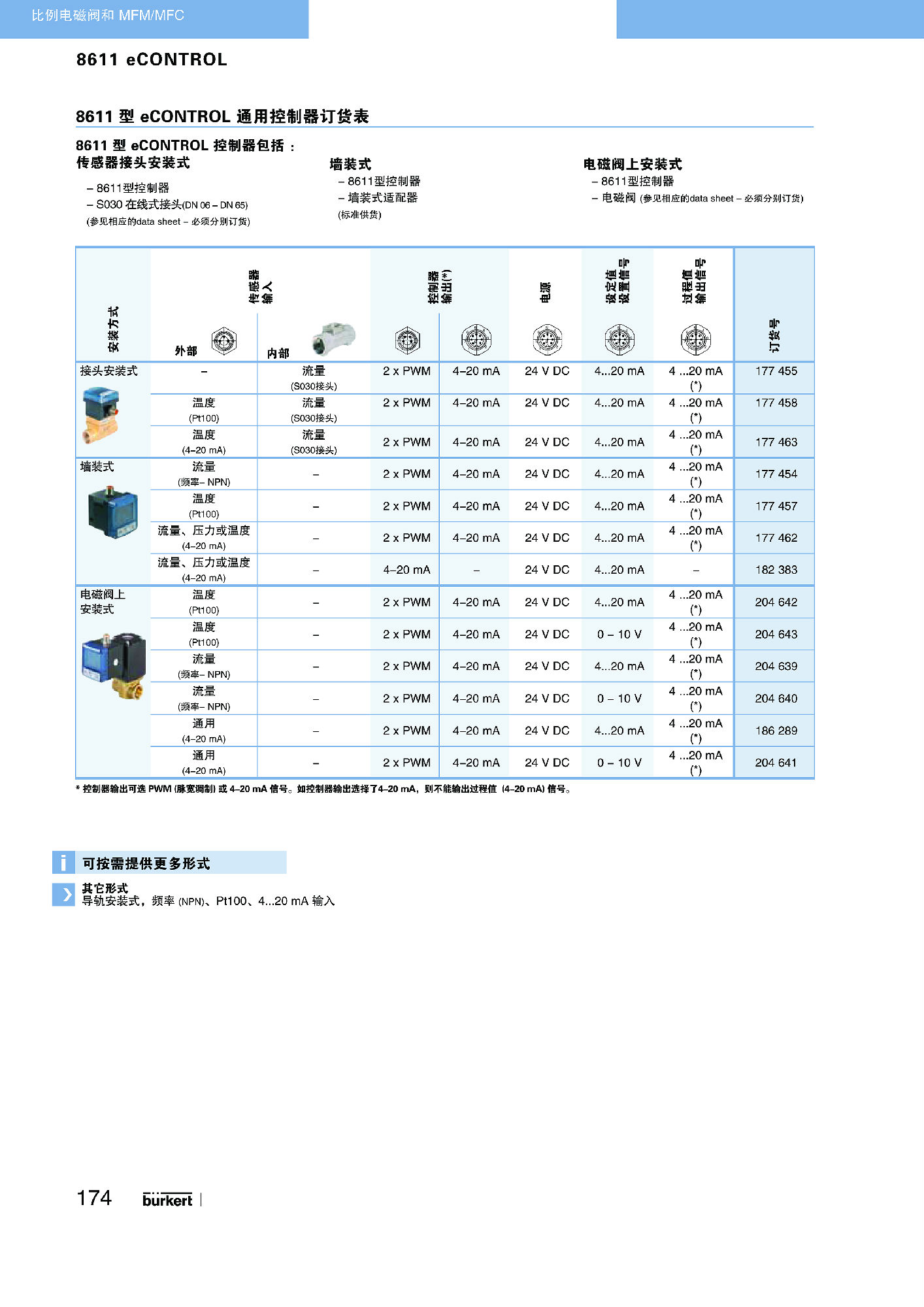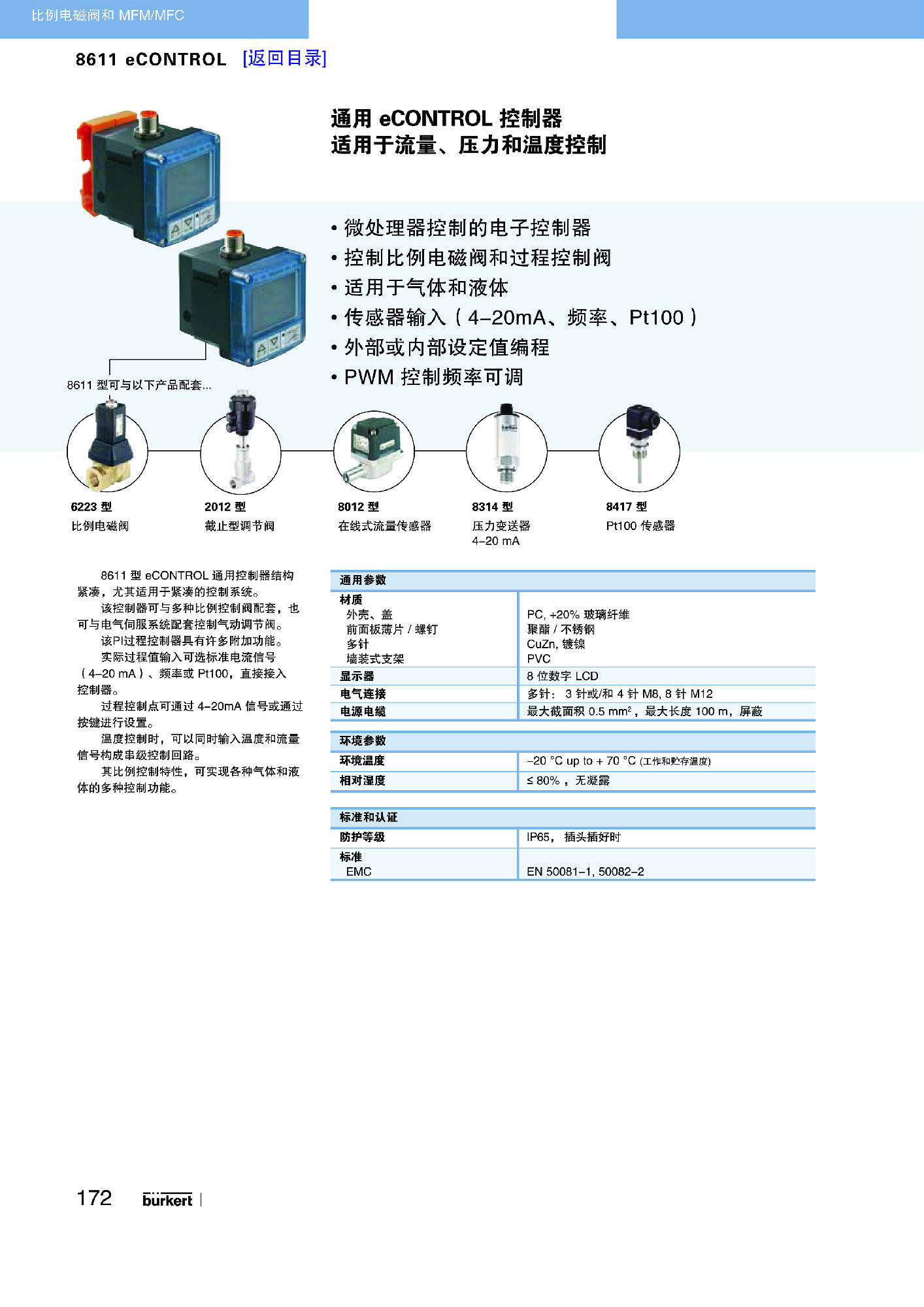 8611 型通用调节器具有紧凑型的结构方式,非常适合同样采用紧凑型设计的调节系统。这种调节器经测试可兼容与所有 Bürkert 比例阀和传感器,在使用标准信号(4-20 mA、0-10 V 或 PWM 输出信号)的前提下,可以与各种非 Bürkert 调节阀相组合。这种具有 PI 特性的过程调节阀,配备了大量的附加功能。通过 3 个模拟输入端,可以将工艺实际值作为标准信号 (4-20mA / 0-10V)、电阻信号 (PT100) 或频率信号读入。通过电流或电压标准信号或者键盘,可以规定工艺额定值。特别适合温度调节任务,可以设计其下方安装有流量调节装置的级联式结构。通过控制比例阀和过程阀,可以在流体技术领域中完成各种各样的调节任务,也可将其应用于液态的或气态的介质。