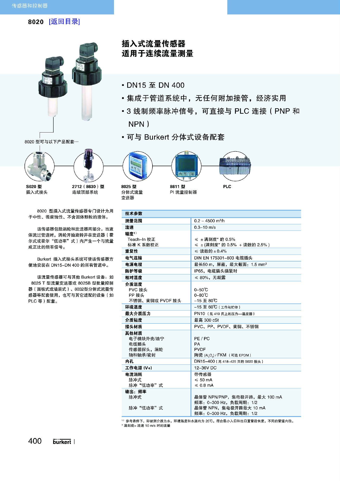 带涡轮的流量计适用于低固体含量的中性和弱腐蚀性液体。由 Bürkert设计的管件系统保证了可方便地将设备安装入 DN20 至 DN400 的管道中。流量计会生成与流速成比例的脉冲频率信号,并可由 Bürkert 发送器/控制器进行处理。