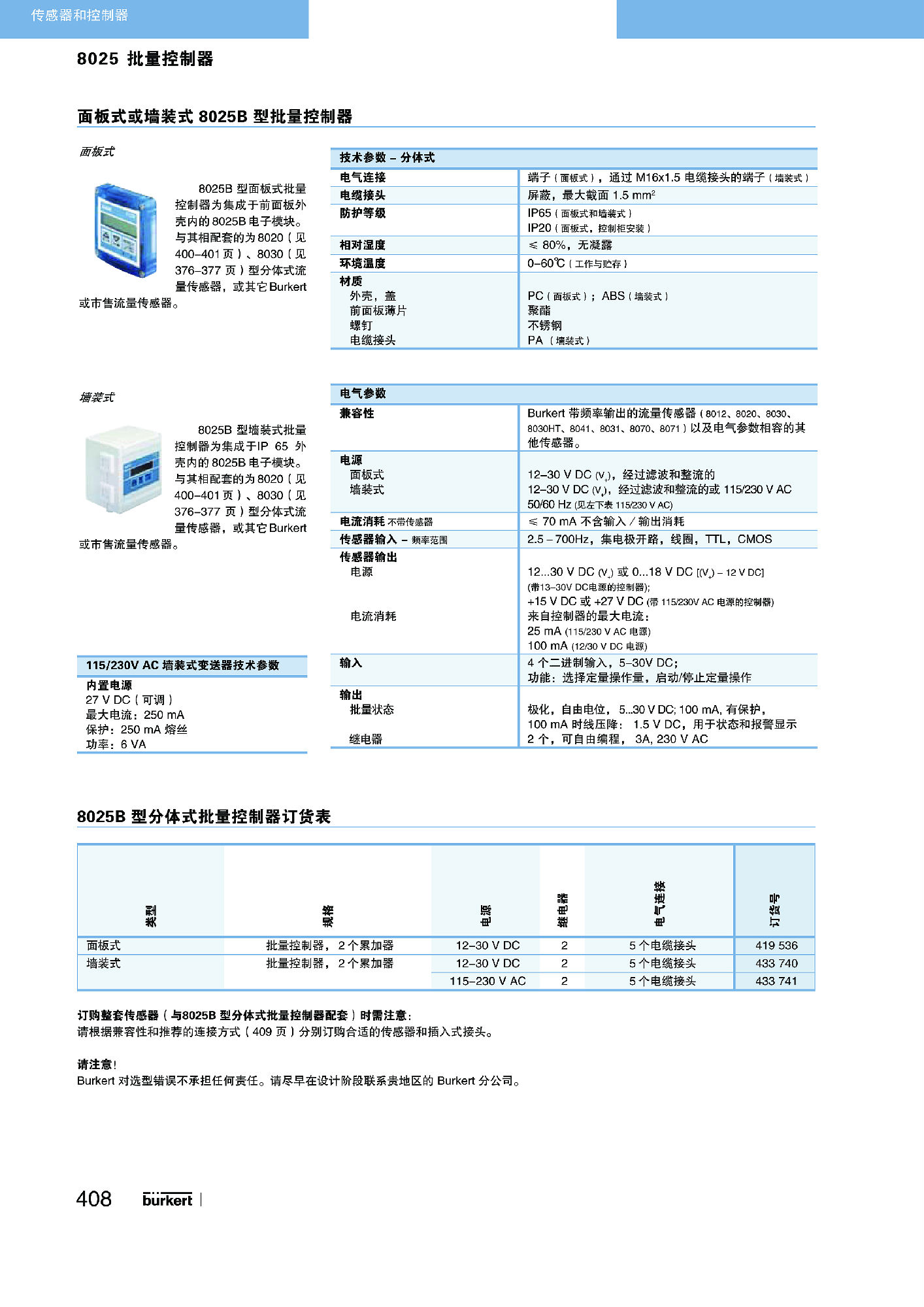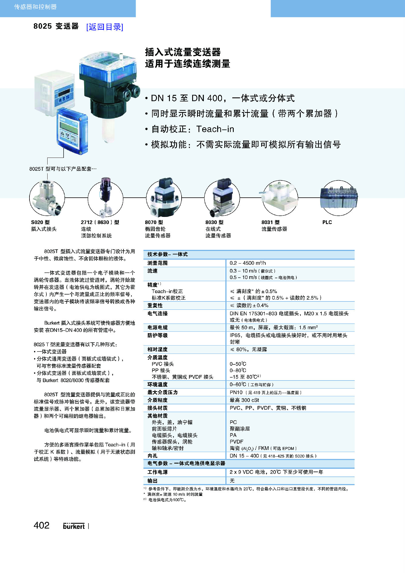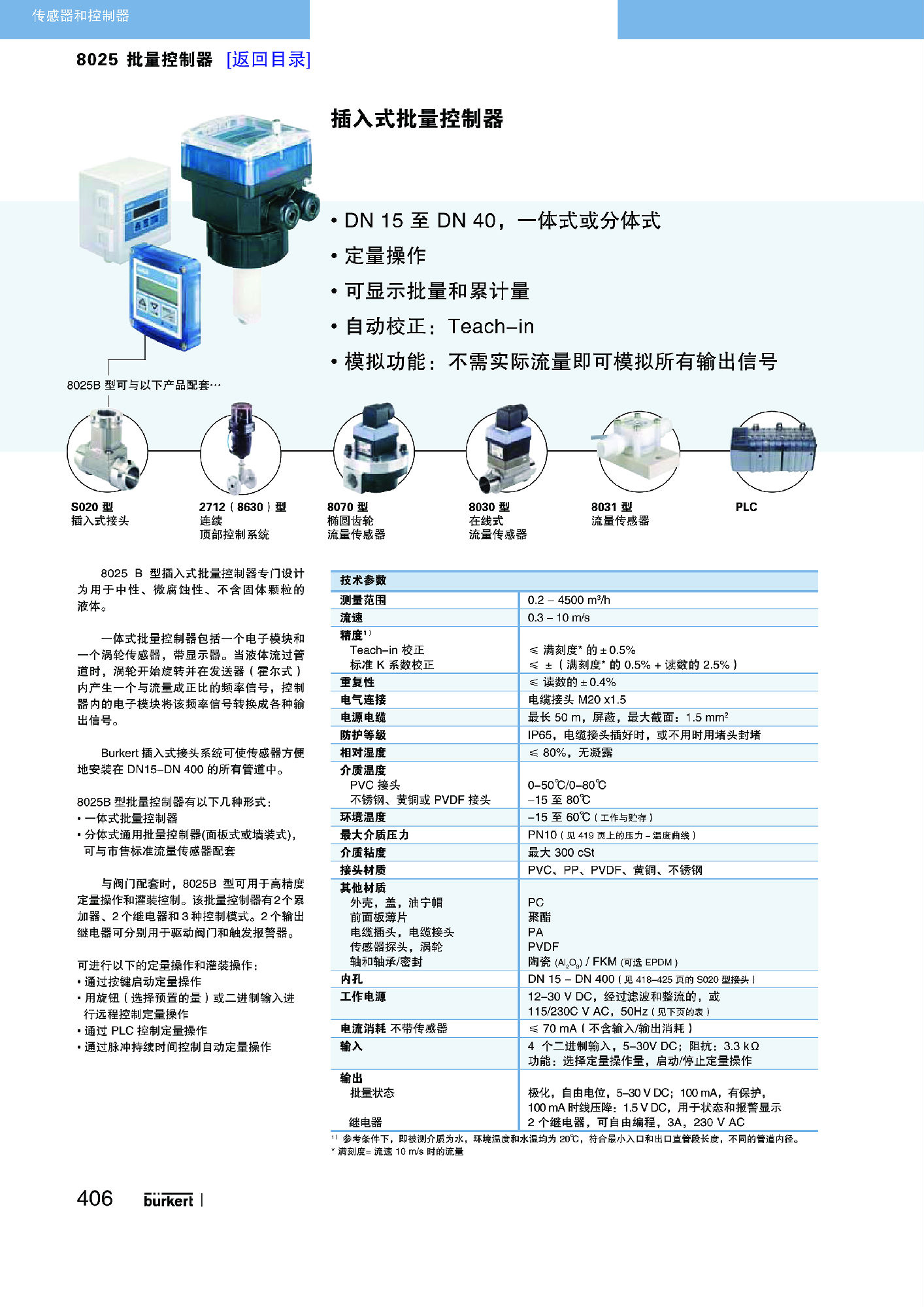 计量仪特别适合中性和弱侵蚀性的、不含固体的液体。计量仪具有不同的结构:带有集成叶轮式传感器的紧凑型计量仪,用于与 Bürkert 8020 / 8030 / 8031 / 8041 / 8071 传感器或其他传感器相组合的、适合开关柜或现场安装的分离式计量仪;带有开路集电极输出端、簧片继电器输出端或线圈的传感器,可利用这种计量仪工作。