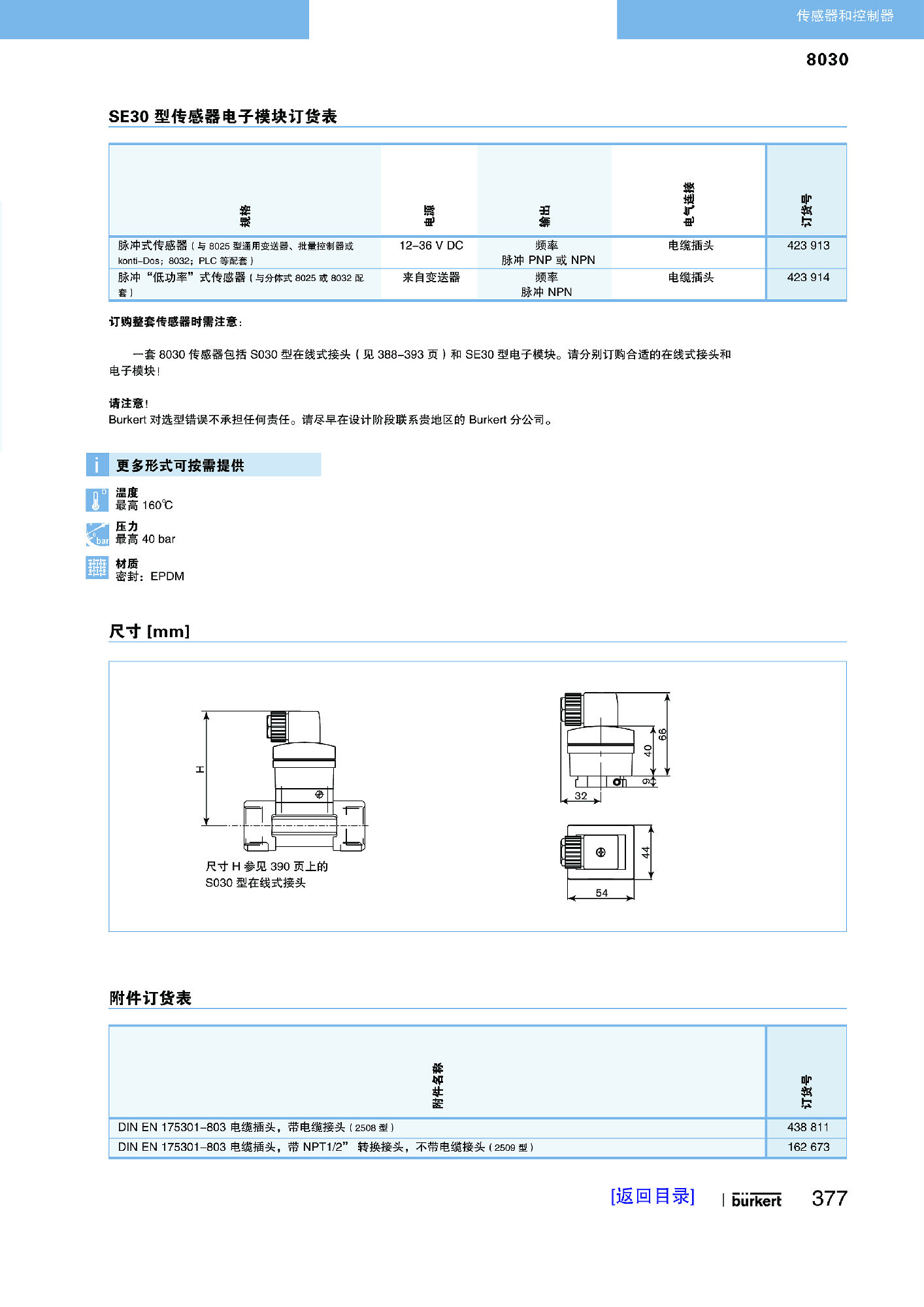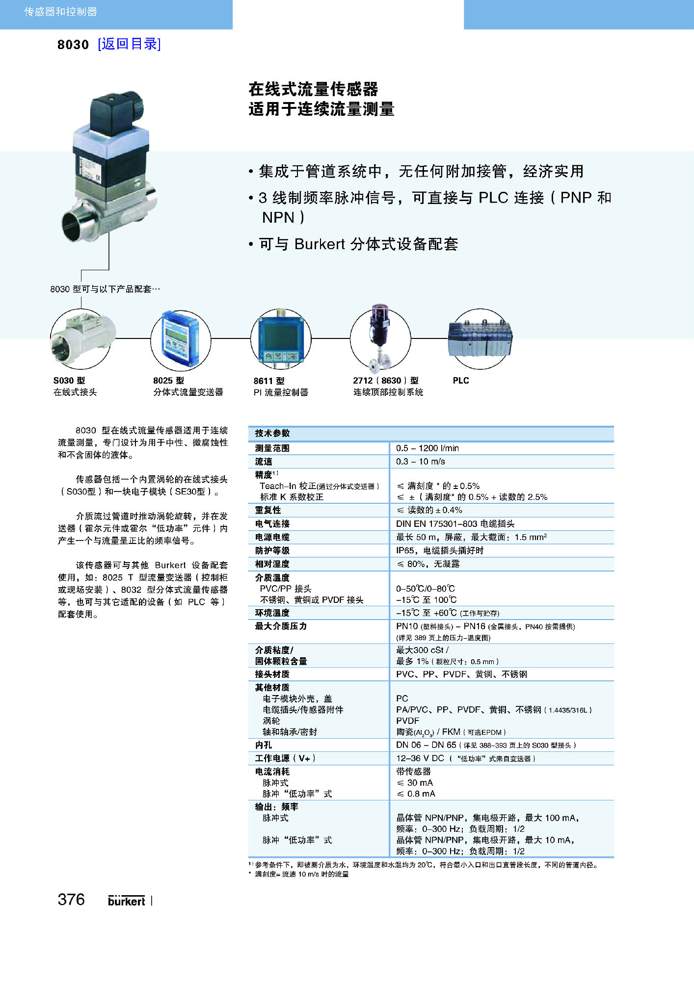 带有叶轮的流量传感器,适合中性和弱侵蚀性的、不含固体的液体。传感器由一个紧凑型接头 (S030) 和一个电子设备模块 (SE30) 构成,通过一个卡口接头可以将两者快速、简单地相连。由 Bürkert 公司设计的接头系统,确保了传感器在所有 DN06 至 DN65 管道中的易安装性。传感器会产生一个与流动速度成正比的脉冲频率信号,利用一个独立式的 Bürkert 传送器/指示器(型号 8025/8032)可以轻易地对该信号进行传输和处理。