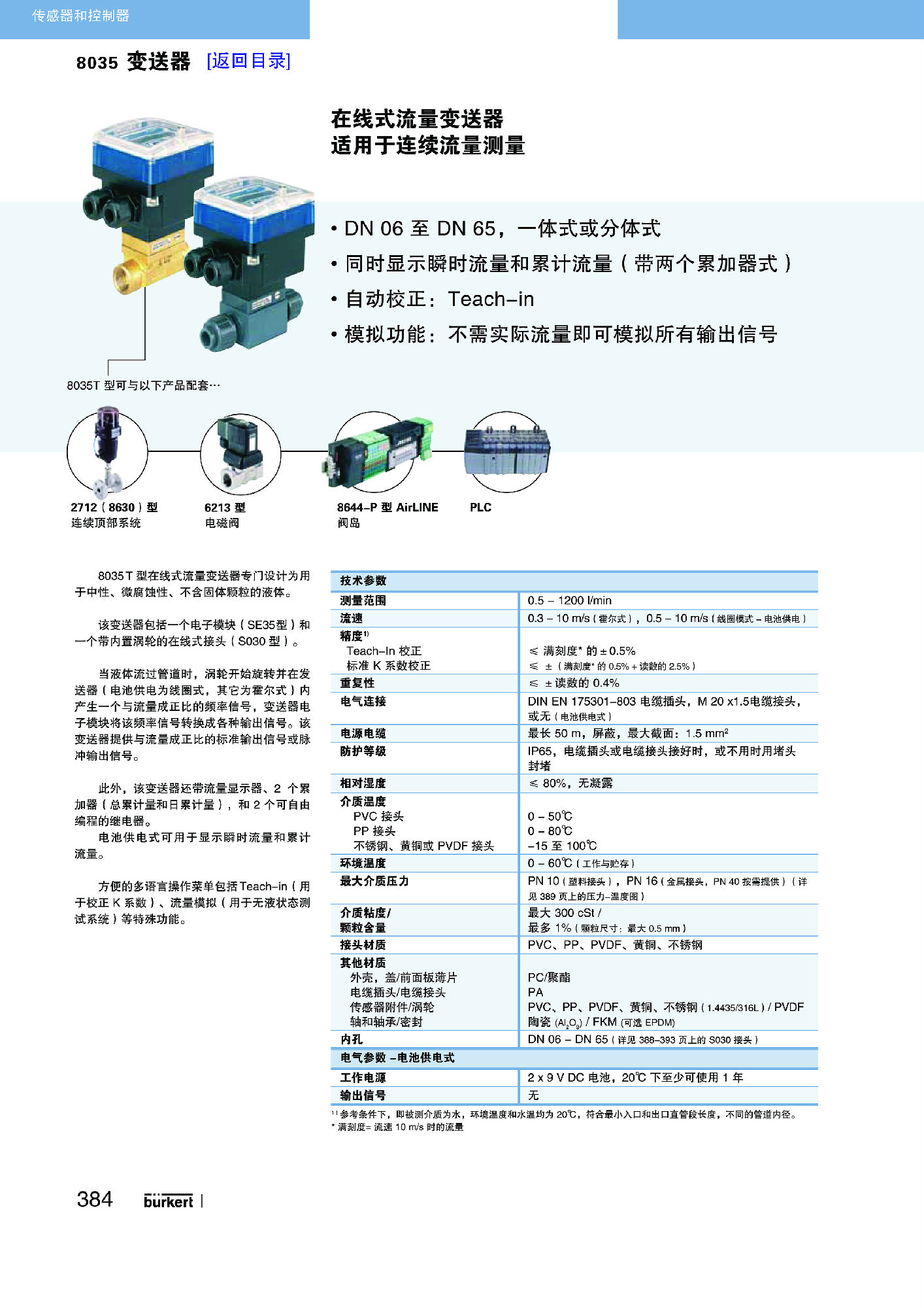 流量传送器特别适合中性和弱侵蚀性的、不含固体的液体。传送器由一个带有叶轮的紧凑型接头 (S030) 和一个电子设备模块 (SE35) 构成,通过一个卡口接头可以将两者快速、简单地相连。由 Bürkert 公司设计的接头系统,确保了传感器在所有 DN06 至 DN65 管道中的易安装性。设备具有不同的结构:带有标准信号输出端的流量传送器、没有输出端而以电池供电的指示器