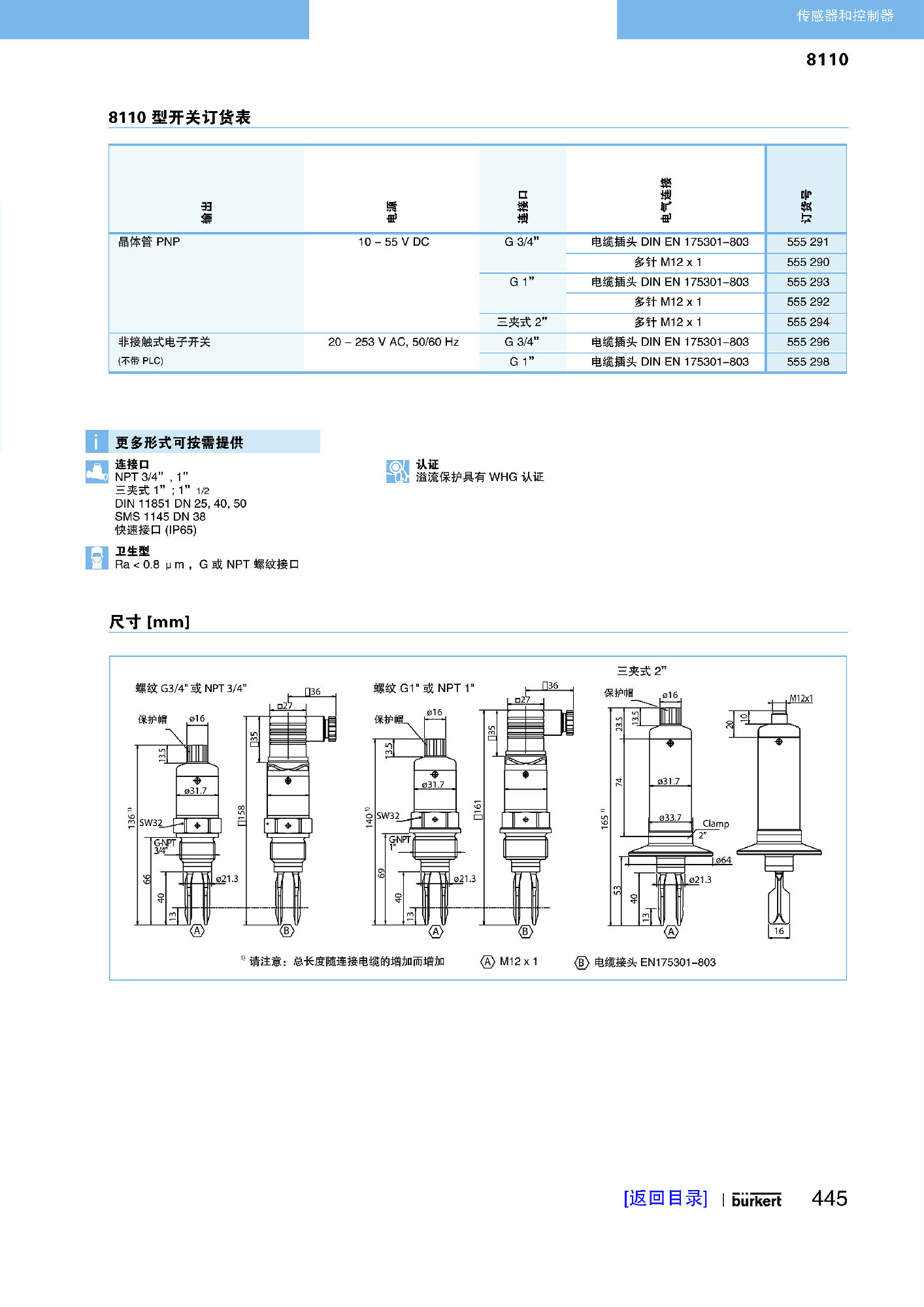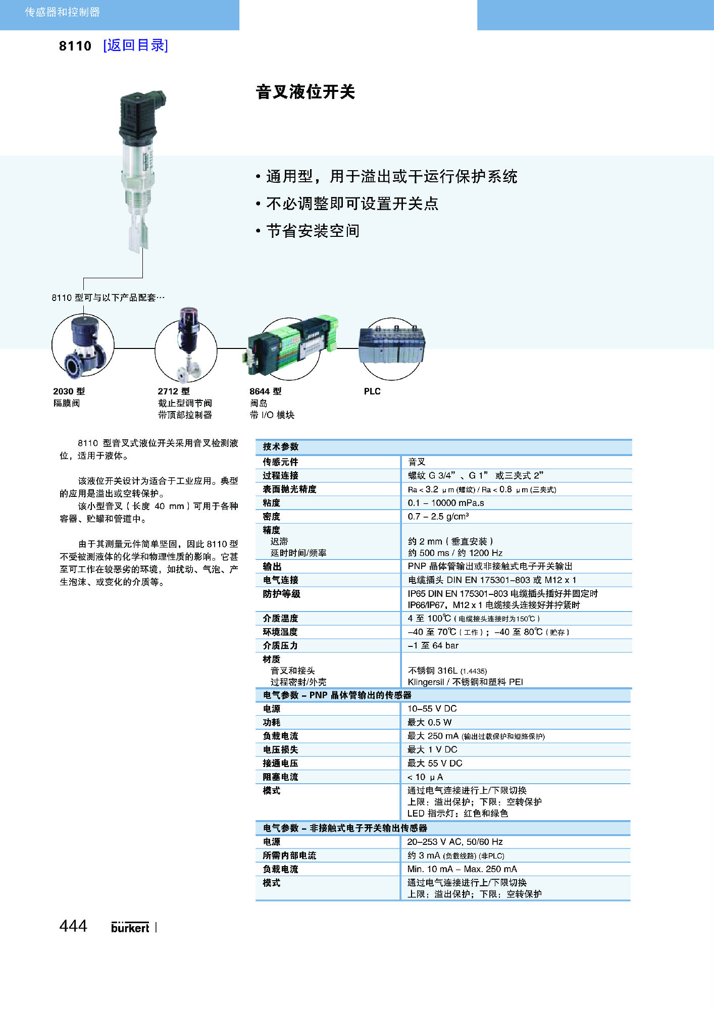 型号 8110 是一种用于液体的液位开关,带有一个作为传感器元件的振叉。其设计适合工业中所有的工艺技术领域,可在液体中使用。典型用途是防止溢流或干运转。小型振叉(40 mm 长)可应用于容器、储罐或管件中。8110 具有一个简单、耐用的测量系统,在使用时,几乎不受液体化学和物理特性的影响。它也可以在恶劣的测量条件下工作,比如涡流、气泡、泡沫形成、粘附、强烈外部振动或变换的填充物。