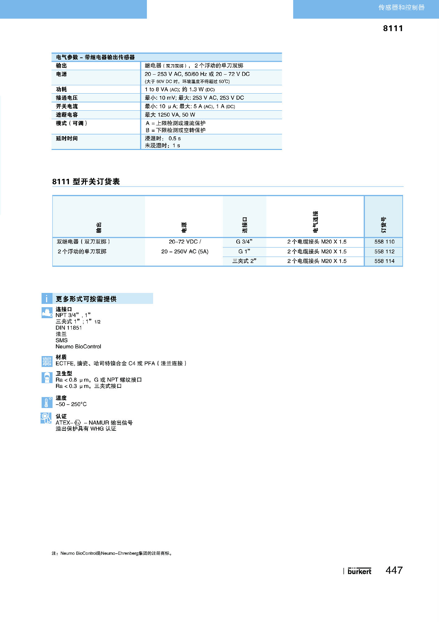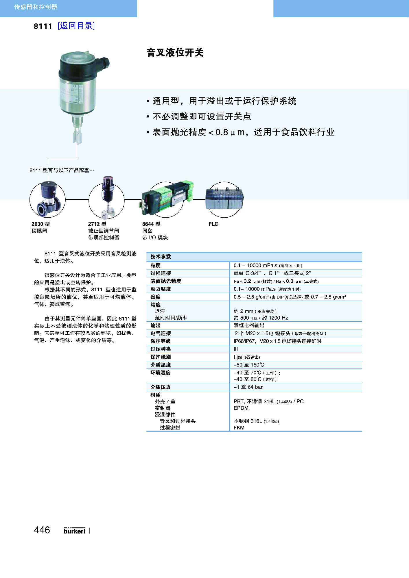 8111 是一种用于液体的液位开关,带有一个作为传感器元件的振叉。其设计适合工业中所有的工艺技术领域,可在液体中使用。典型用途是防止溢流或干运转。根据结构的不同,可将设备用于监督或控制易爆区域的液位,也可将其应用于可燃的液体、气体、雾气或蒸汽。8111 具有一个简单、耐用的测量系统,在使用时,几乎不受液体化学和物理特性的影响。它也可以在恶劣的测量条件下工作,比如涡流、气泡、泡沫形成、粘附、强烈外部振动或变换的填充物。