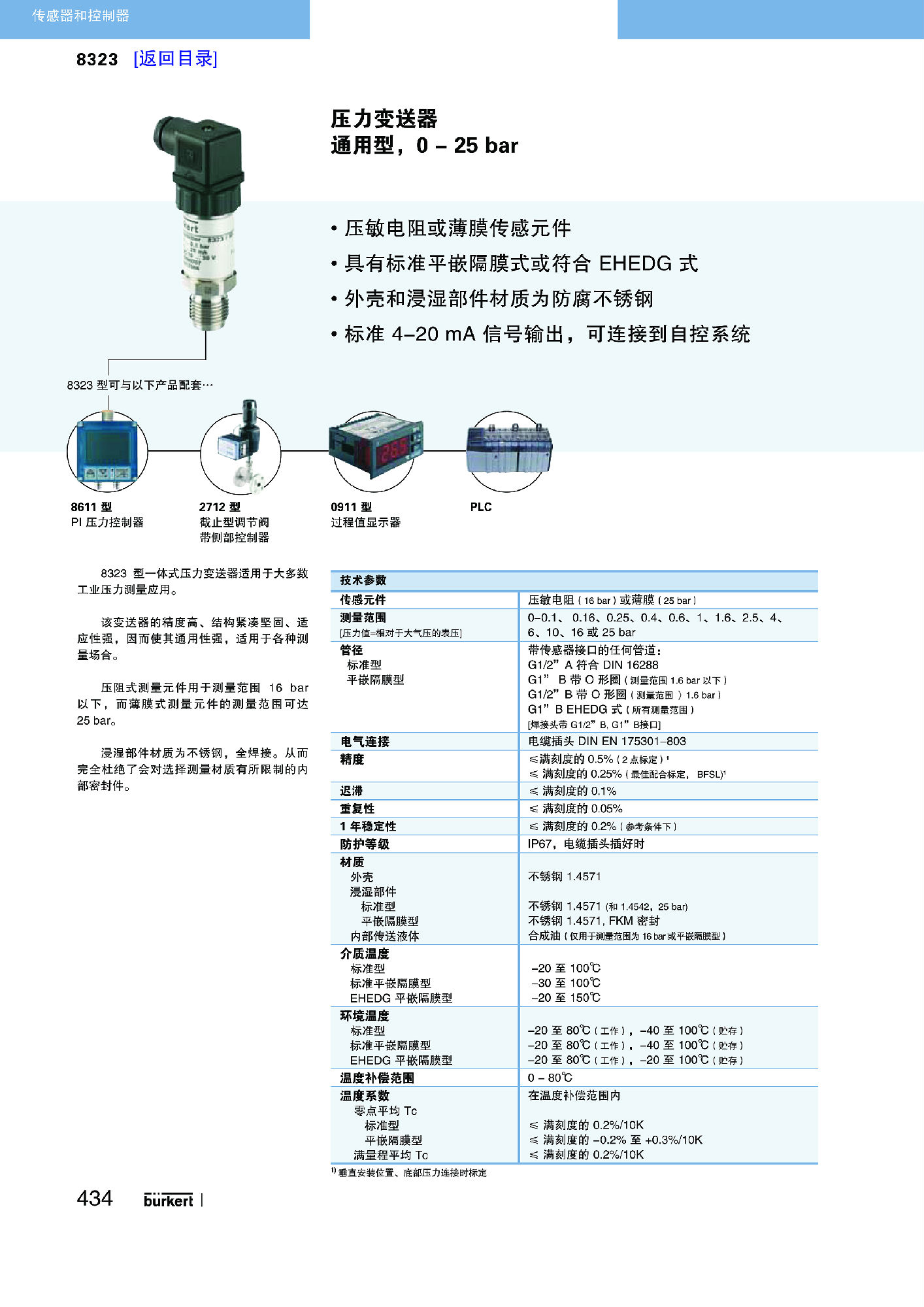 压电式或薄膜式传感器元件 可装配正面齐平的标准型隔膜或符合 EHEDG 的隔膜 外壳以及与介质相接触的部件由耐腐蚀的不锈钢制成 适合连接自动化系统的标准信号 4...20 mA 适合快速安装和维修的插头