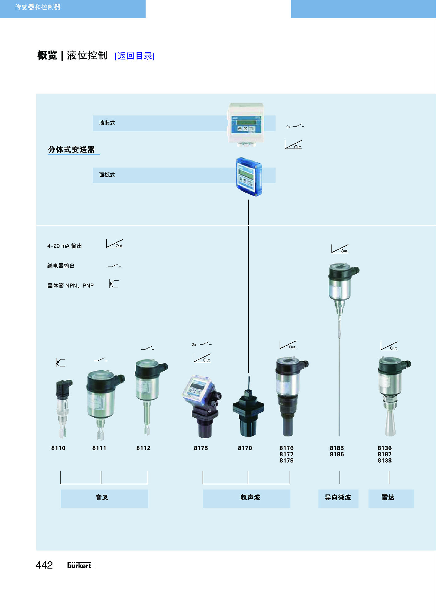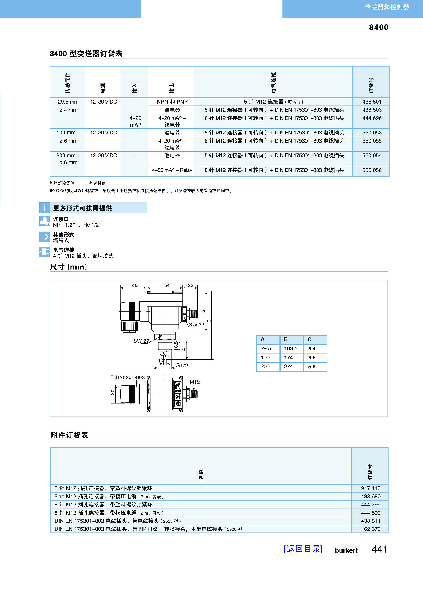 这种智能的微型传感器/开关具有一个特大号显示器,特别适合监控极限值或者 On/Off 或持续型调节电路。存在两种可用的结构:8400 紧凑型或 8400 墙壁安装型。这种适合墙壁安装的结构,必须被插到到一个事先安装在墙壁上的固定架中,在使用时需要结合一个远程温度传感器。可直接在显示屏上通过按键对开关点进行编程,或者也可选择从外部利用 PLC 通过一个 4-20 mA 标准信号输入端进行编程。另外,可借助于一个 4-20 mA 信号将工艺值传送到 PLC 上。利用商业通用的 T 型接头通过标准接头 (G 1/2),在工艺管道上进行 8400 的工艺连接。