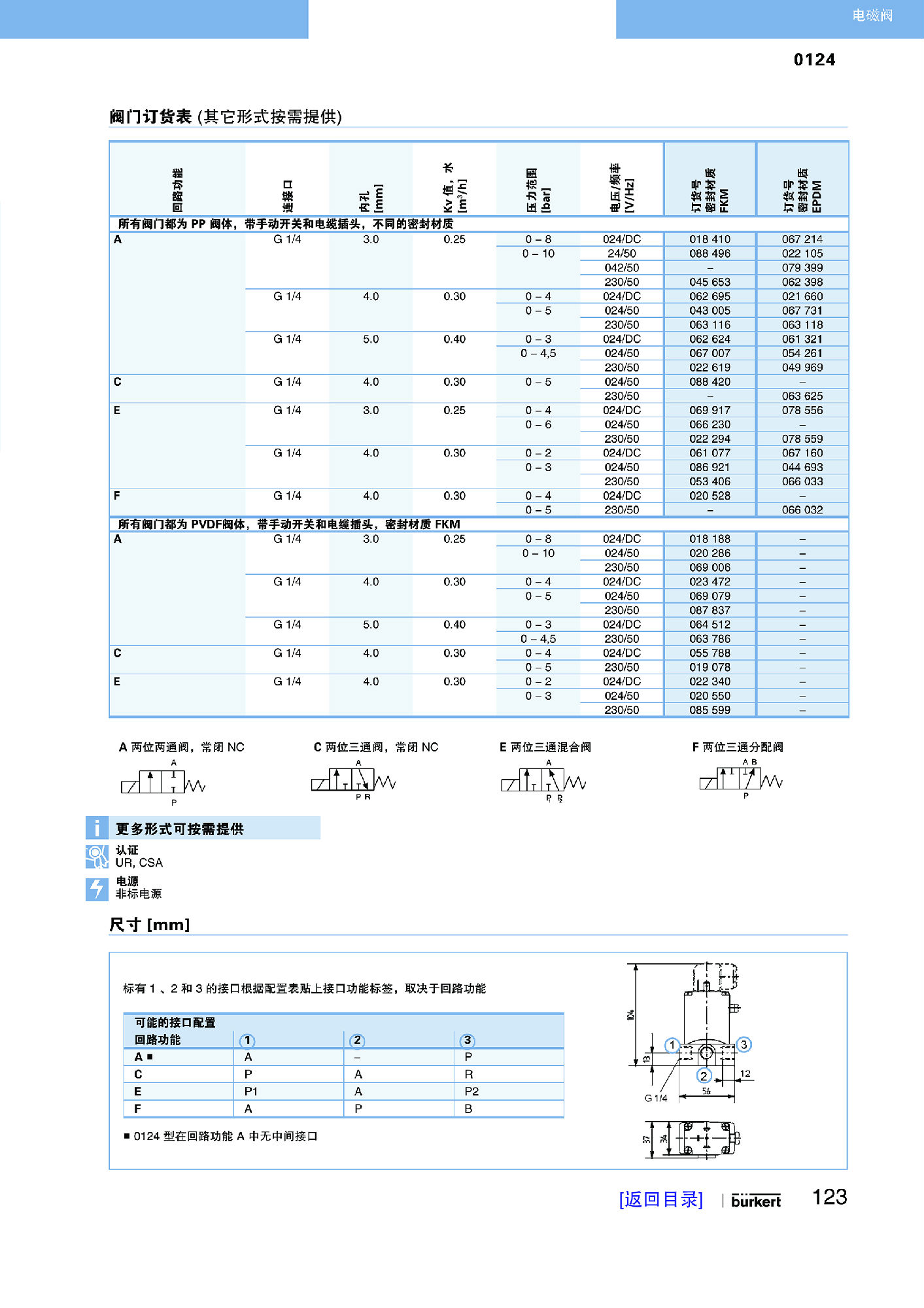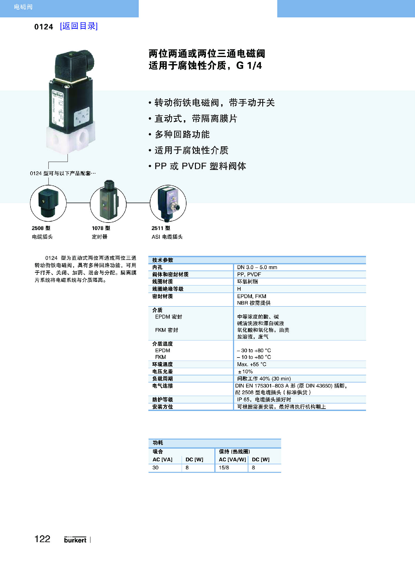 型号 0124 是一种直动式、二位二通或二位三通旋启式衔铁电磁阀。提供的产品具有多种作用,可用于打开、关闭、计量、混合和分配等操作。磁性系统通过一个隔膜系统与介质室隔开。