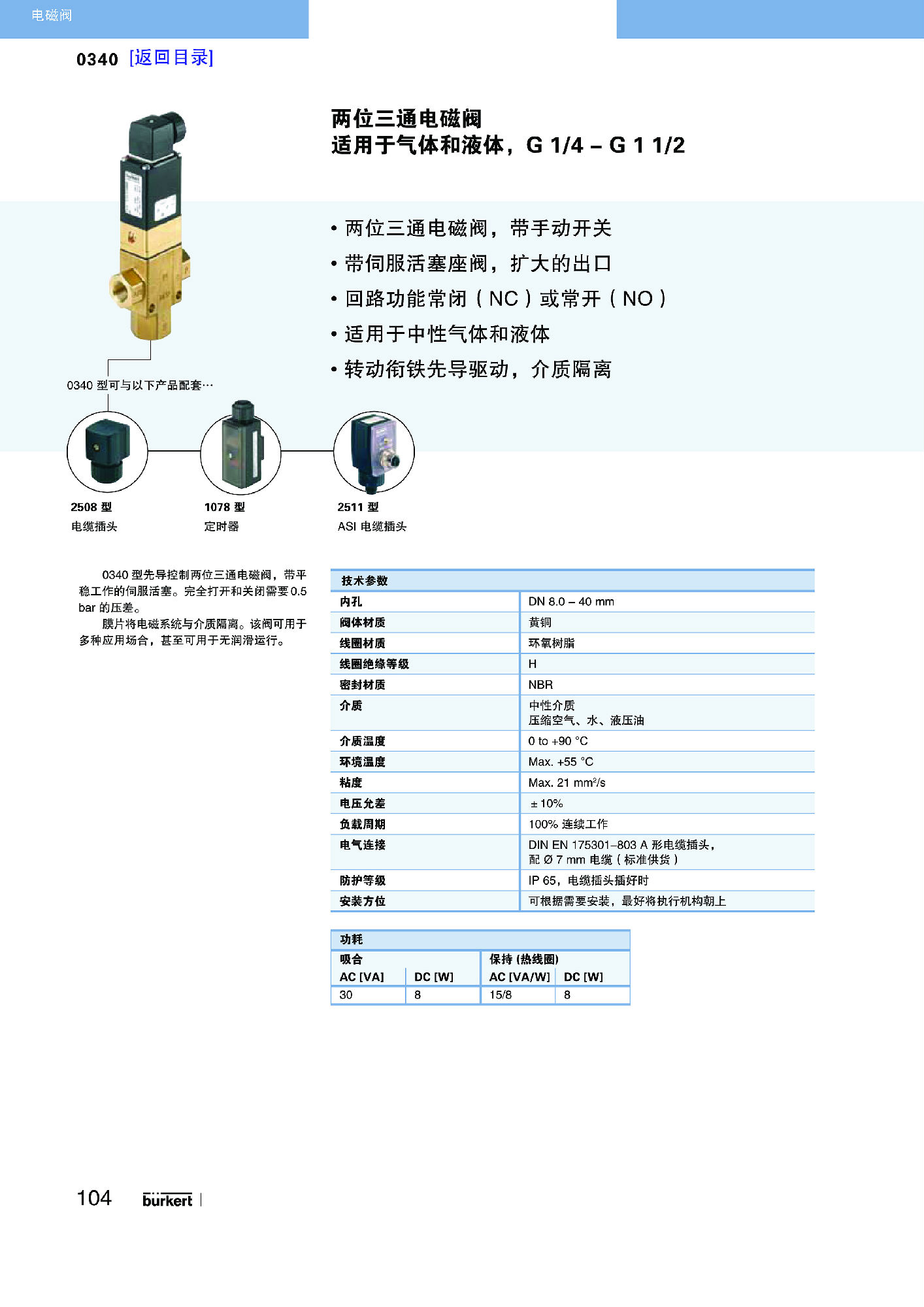 0340 为伺服辅助式两位三通活塞电磁阀。要完全打开或关闭阀门,需要一个最小压差。其先导阀为免维护、介质隔离的两位三通转动衔铁电磁阀(0331型)。该先导阀的常开和常闭功能可方便地进行转换:只需将其在主阀座上进行旋转即可。电磁线圈采用耐化学腐蚀的环氧树脂封装。0340型配备了手动开关,可用于调试和测试。如有节能要求,所有线圈都可提供节电式,或脉冲式。开关状态可以通过位置反馈以二进制或 NAMUR 信号显示。与 DIN EN 17301-803 A 型电缆插头配套,该阀的安全防护等级为 IP65/67。