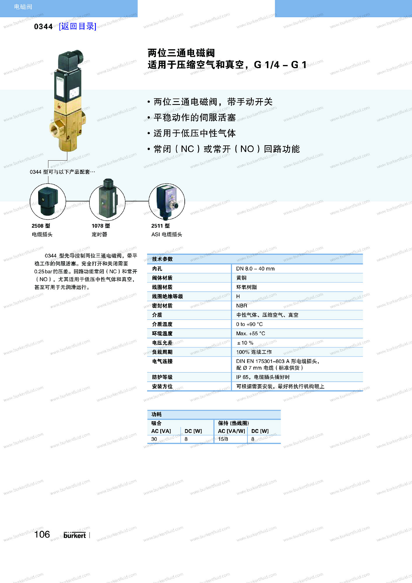 0344 为伺服辅助式两位三通活塞电磁阀。要完全打开或关闭阀门,需要一个最小压差。其先导阀为免维护、介质隔离的两位三通转动衔铁电磁阀(0331型)。该先导阀的常开和常闭功能可方便地进行转换:只需将其在主阀座上进行旋转即可。电磁线圈采用耐化学腐蚀的环氧树脂封装。0344型配备了手动开关,可用于调试和测试。如有节能要求,所有线圈都可提供节电式,或脉冲式。开关状态可以通过位置反馈以二进制或 NAMUR 信号显示。与 DIN EN 17301-803 A 型电缆插头配套,该阀的安全防护等级为 IP65/67。