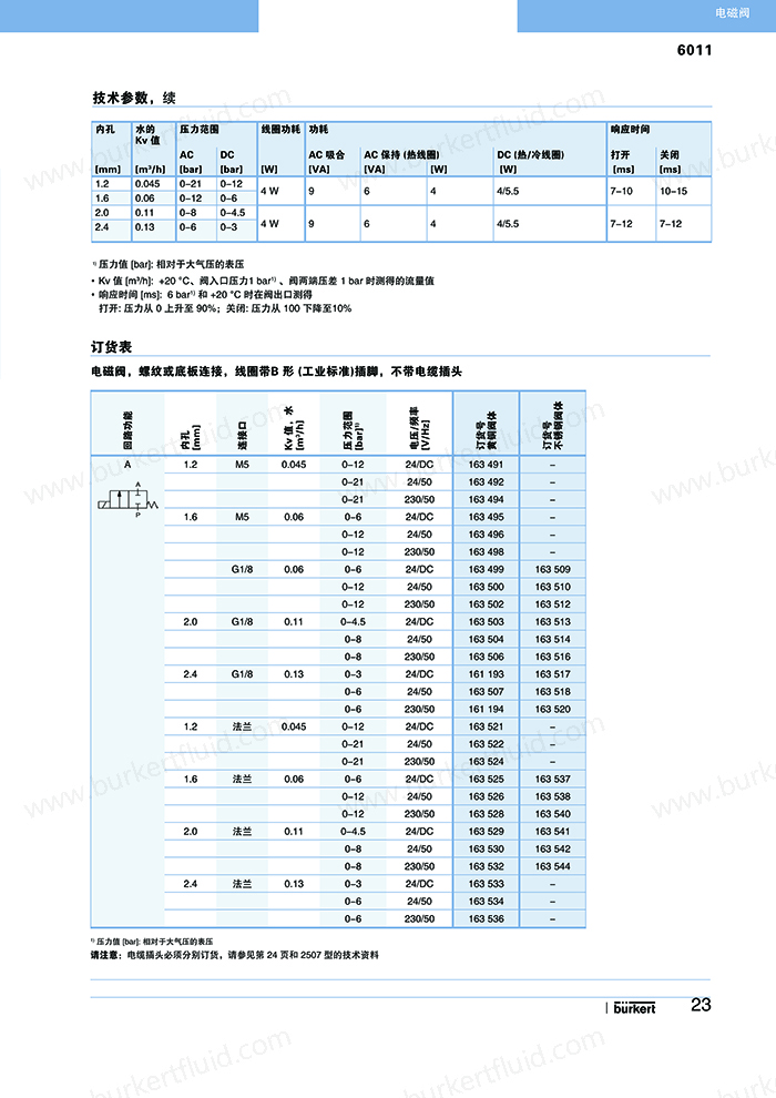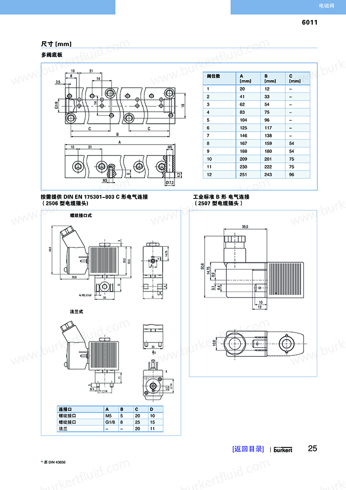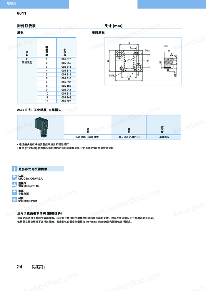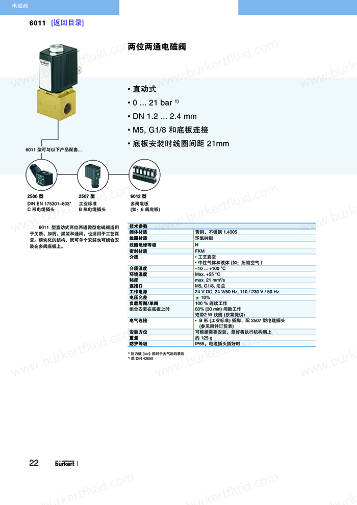 6011为直动式柱塞电磁阀。止动器与柱塞导管焊接在一起,以提高耐压性和密封性。根据不同的应用,可以选择各种密封材质。Bürkert专用底板接口使该阀可组合安装在底板上,节省空间。可选插管接头式连接软管。电磁线圈采用聚酰胺封装。与 DIN EN 17301-803 B 型或 C 型电缆插头配套,该阀的安全防护等级为 IP65。