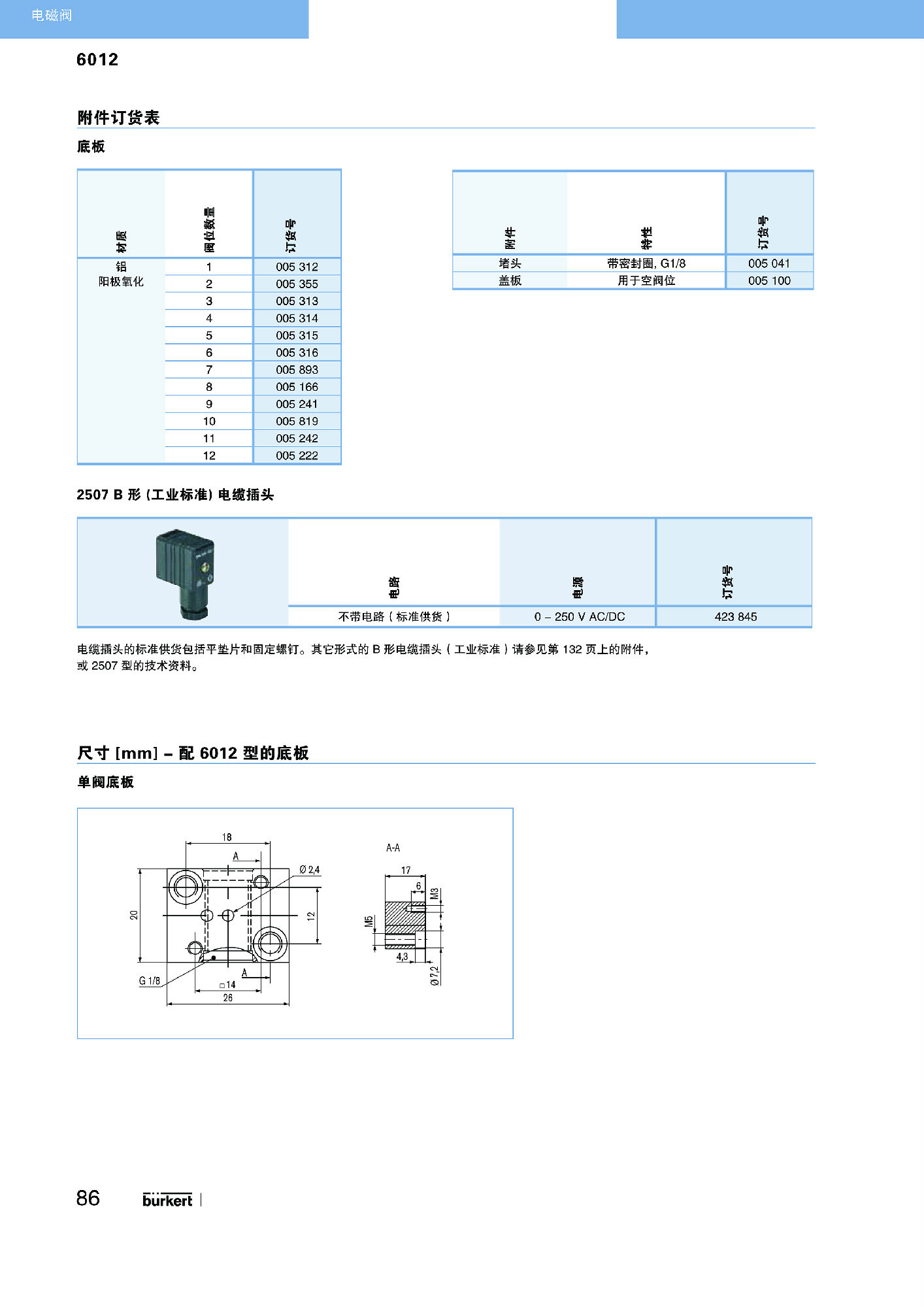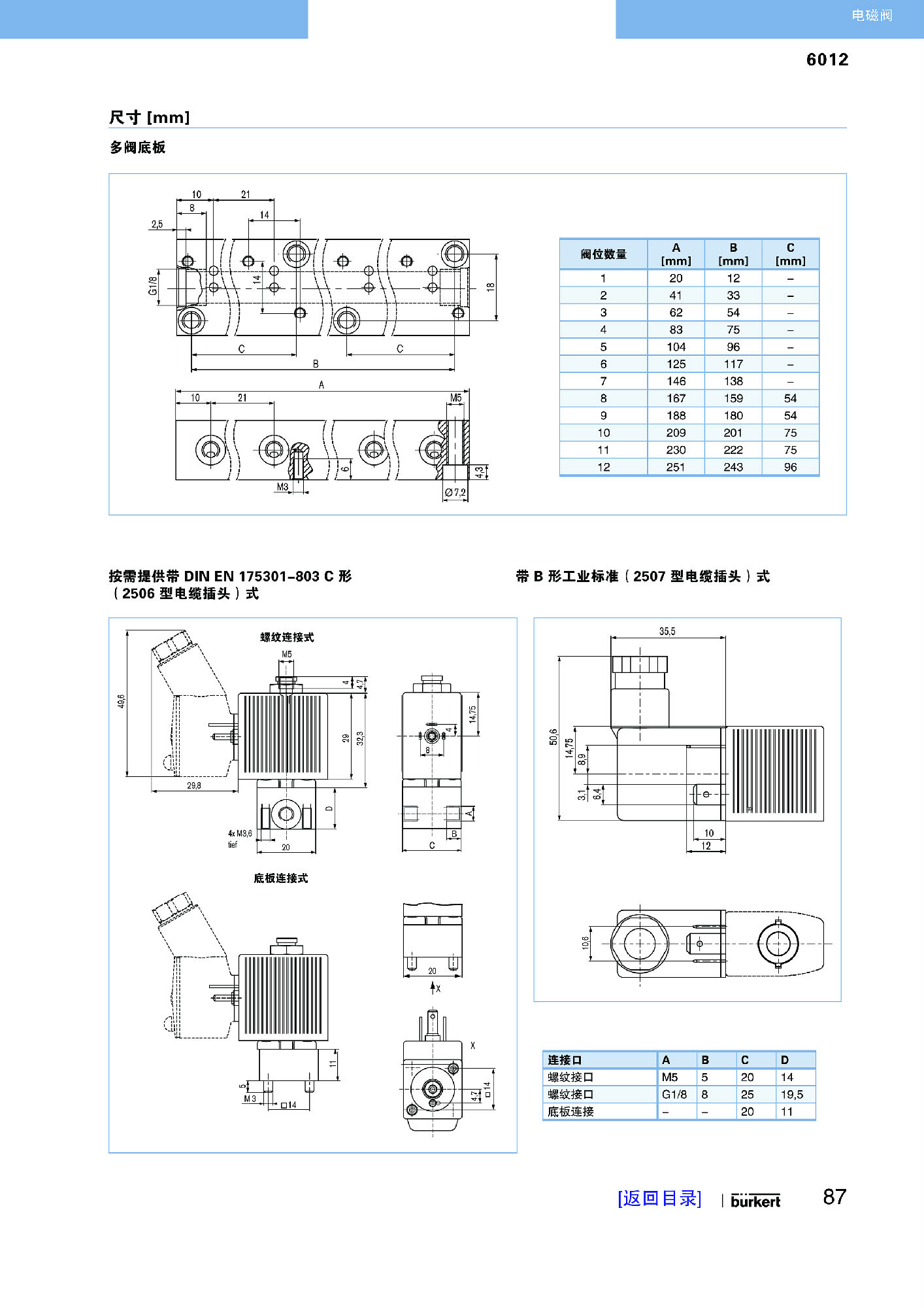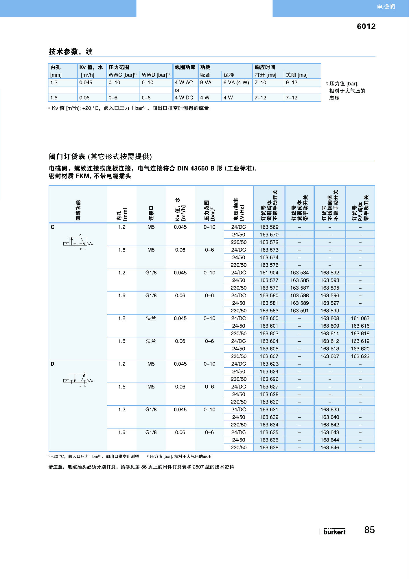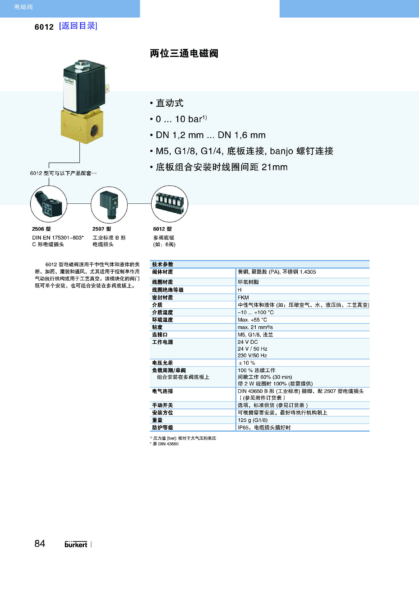 6012为直动式柱塞电磁阀。止动器与柱塞导管焊接在一起,以提高耐压性和密封性。根据不同的应用,可以选择各种密封材质。Bürkert专用底板接口使该阀可组合安装在底板上,节省空间。可选插管接头式连接软管。Banjo 接口式尤其适用于直接安装在气动阀上。可选带手动开关式,用于快速调试和最佳的维护。 电磁线圈采用聚酰胺封装。与 DIN EN 17301-803 B 型或 C 型电缆插头配套,该阀的安全防护等级为 IP65。