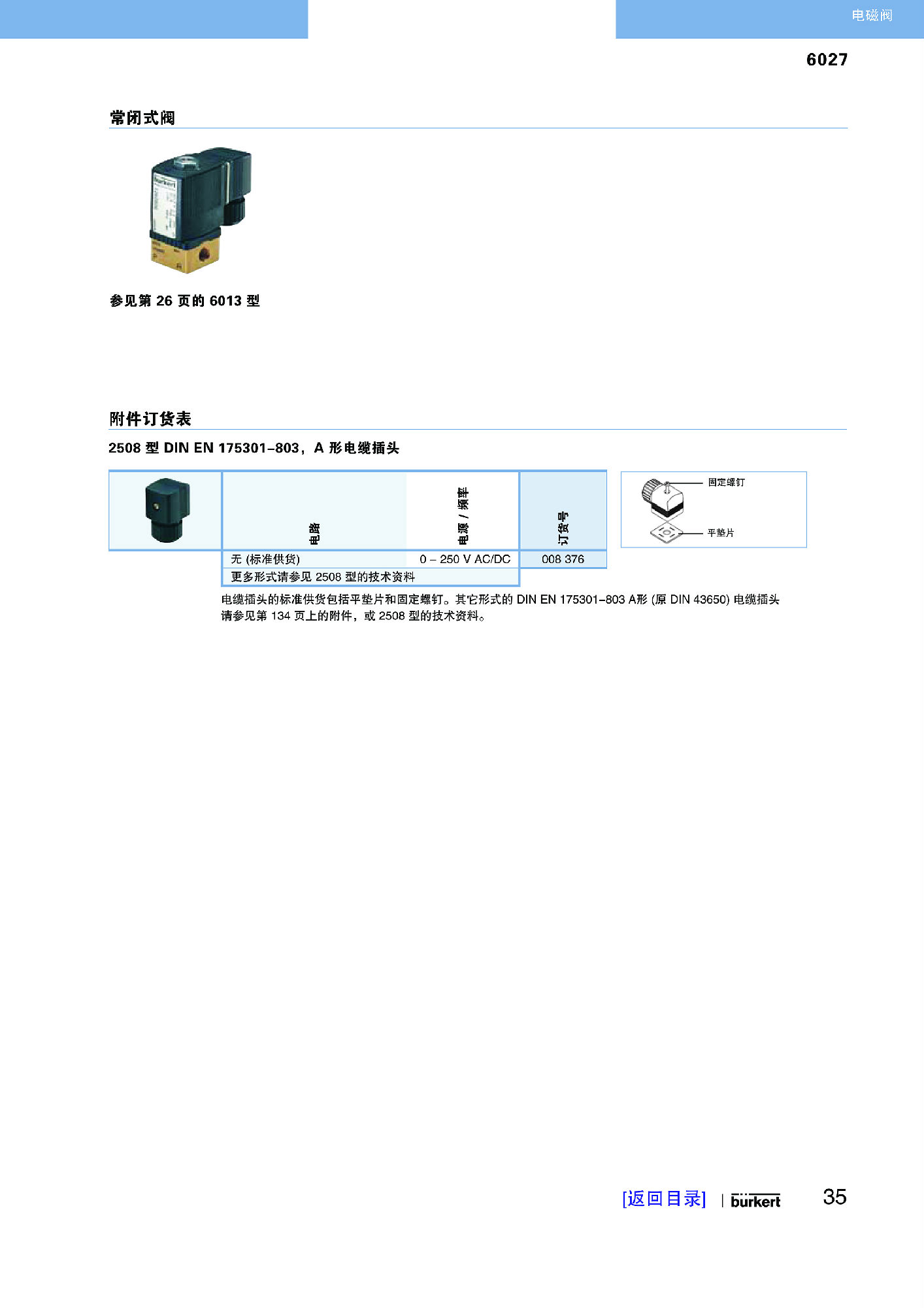 6027为直动式柱塞电磁阀。止动器与柱塞导管焊接在一起,以提高耐压性和密封性。根据不同的应用,可以选择各种密封材质。电磁线圈采用耐化学腐蚀的环氧树脂封装。具有带“kick and drop”电子线路式(2511插头),用于过励磁和降低功耗。可选滑环轴承以提高使用寿命。采用专用密封技术,使该阀适用于高压应用。与 DIN EN 17301-803 A 型电缆插头配套,该阀的安全防护等级为 IP65,不锈钢阀体式 NEMA 4X。