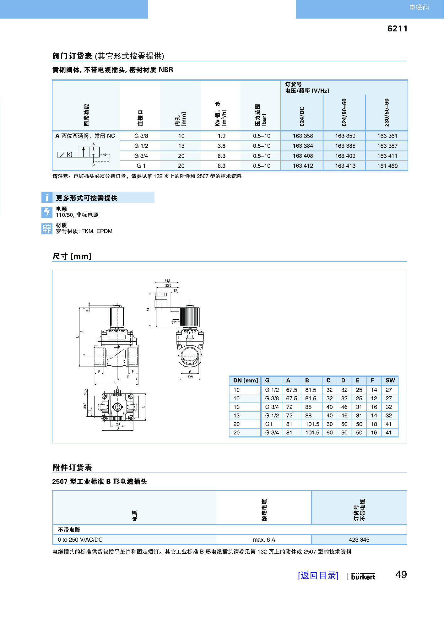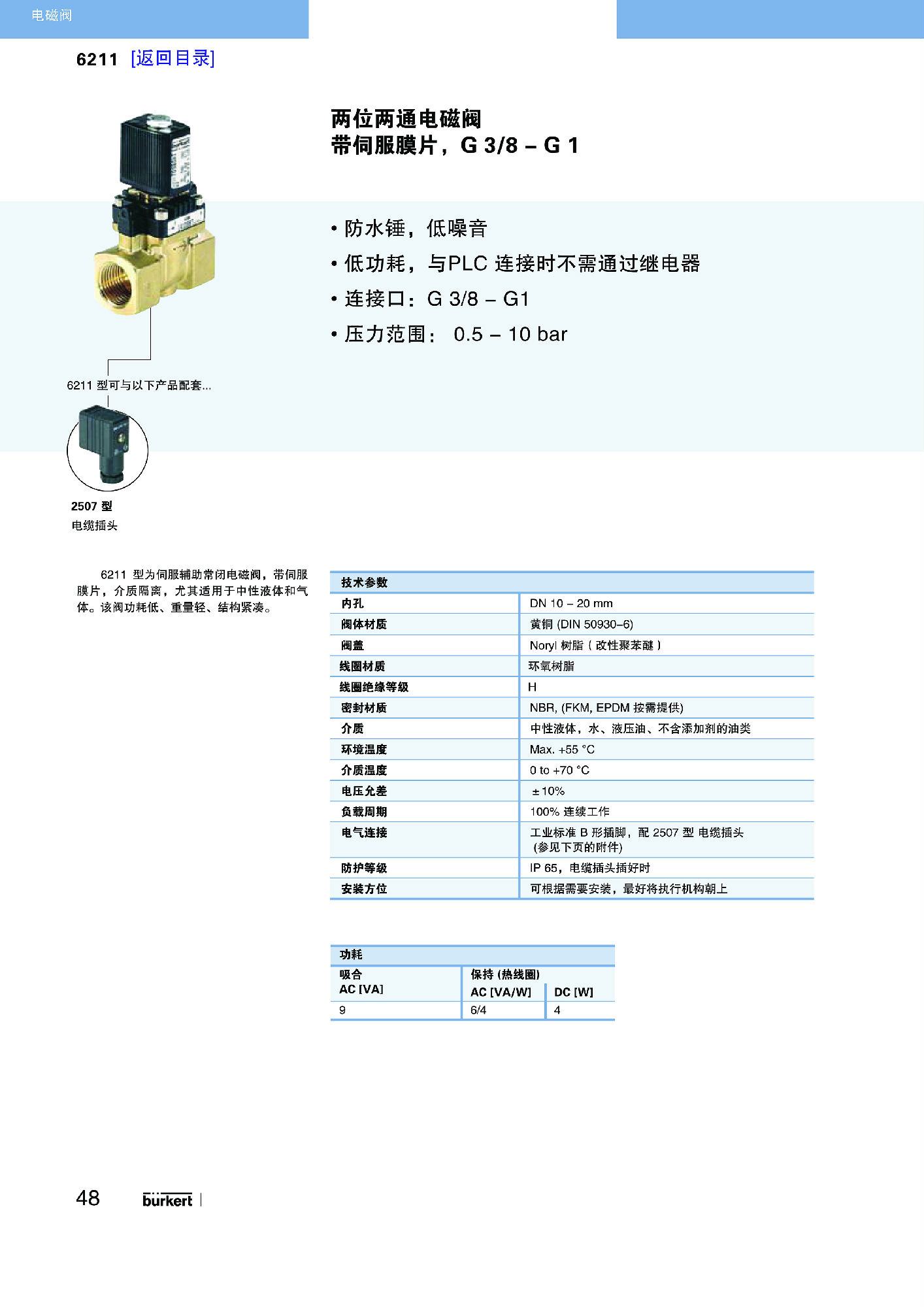 型号 6211 是一种二位二通的先导式电磁阀,带有伺服隔膜。特别适合中性的液态和气态介质。该种阀门电功率需求小,重量低,采用紧凑型设计。在无流量的状态下,会在弹簧力的作用下关闭。在接通状态下,磁铁会首先打开先导式阀座。在隔膜上方的压力消除之后,通过下部的介质压力将其顶起。阀门打开。阀门内部件的特别构造和几何形状,使得阀门在压力峰值很小时即可发挥平缓的关闭功能。