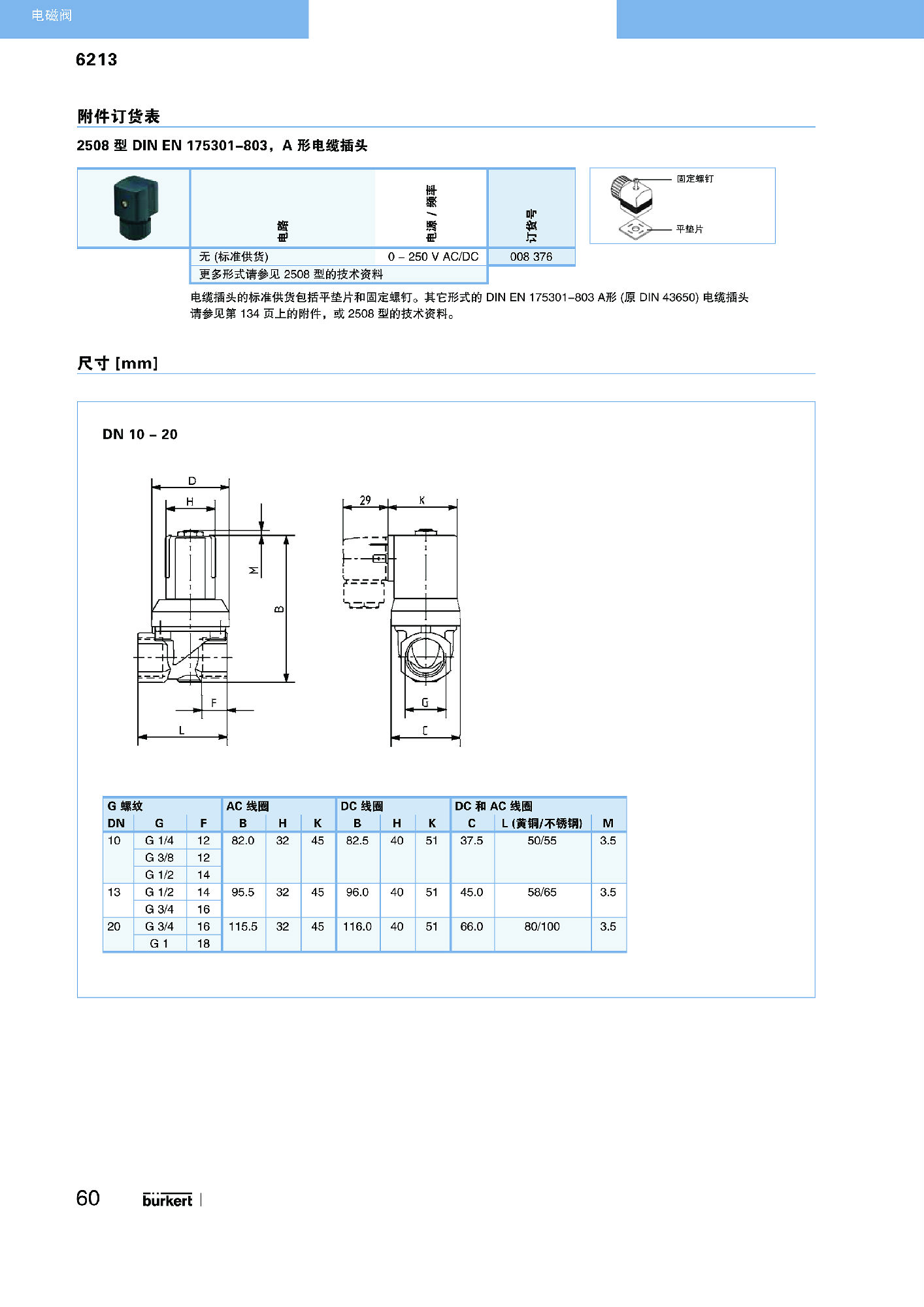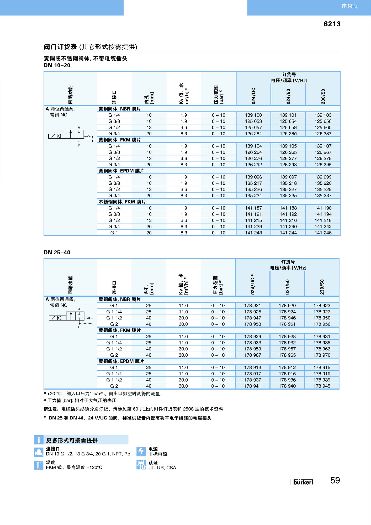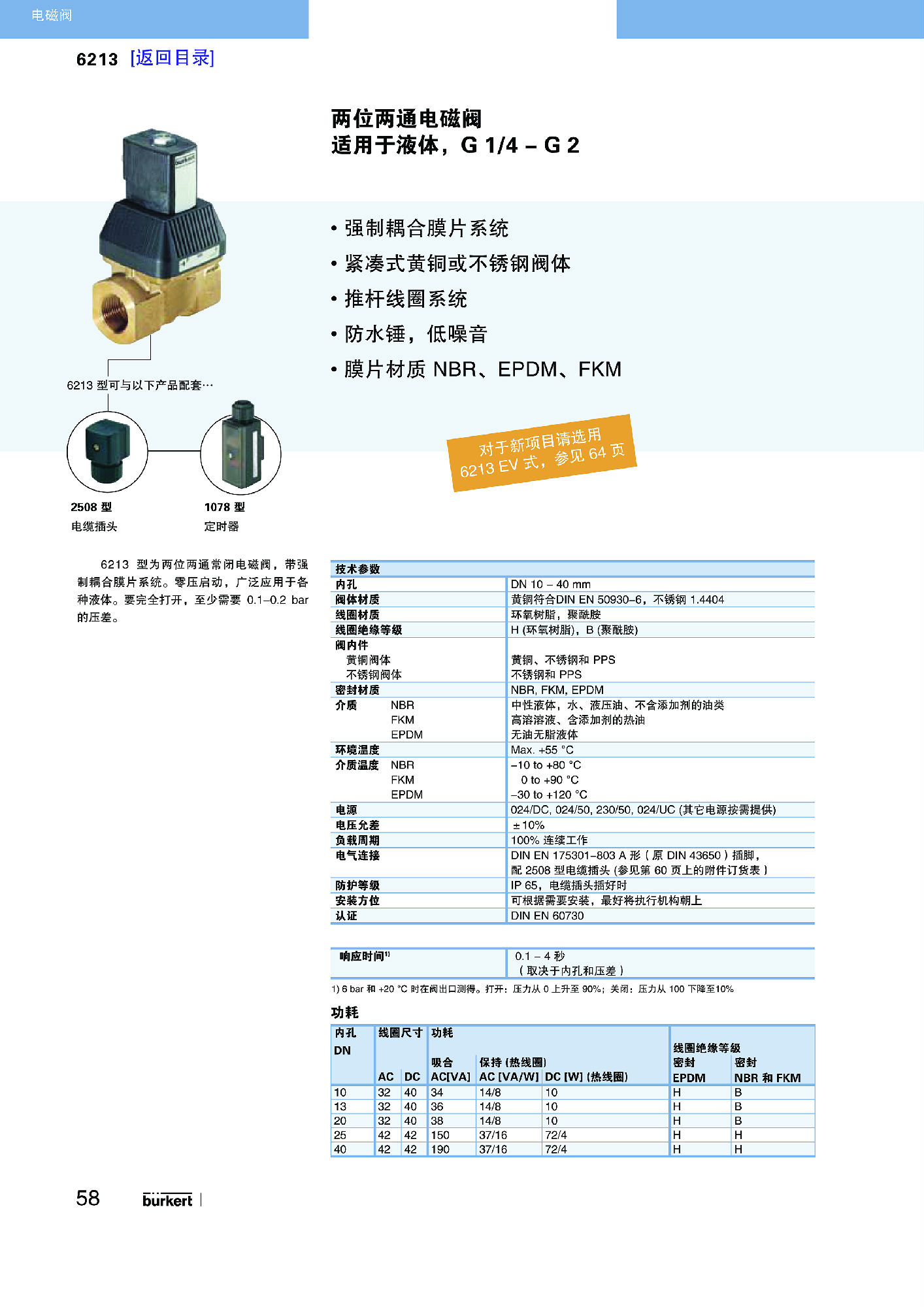 6213 EV 为伺服辅助式S.EV系列电磁阀。通过膜片的弹性耦合打开阀门。其标准型适用于液体。要完全打开阀门,需要一个最小压差。有一个特殊型(HP00)可以不需要压差打开阀门,适合于气体和真空应用。根据不同的应用,可以选择各种膜片材质。标准供货的黄铜阀体符合所有欧洲饮用水标准的要求。具有无铅或抗脱锌腐蚀黄铜式,适合于其它应用。阀体材质还有不锈钢式。电磁线圈采用耐化学腐蚀的环氧树脂封装。所有线圈都可以带降功耗电子线路,用于节能。与 DIN EN 17301-803 A 型电缆插头配套,该阀的安全防护等级为 IP65,不锈钢阀体式 NEMA 4X。