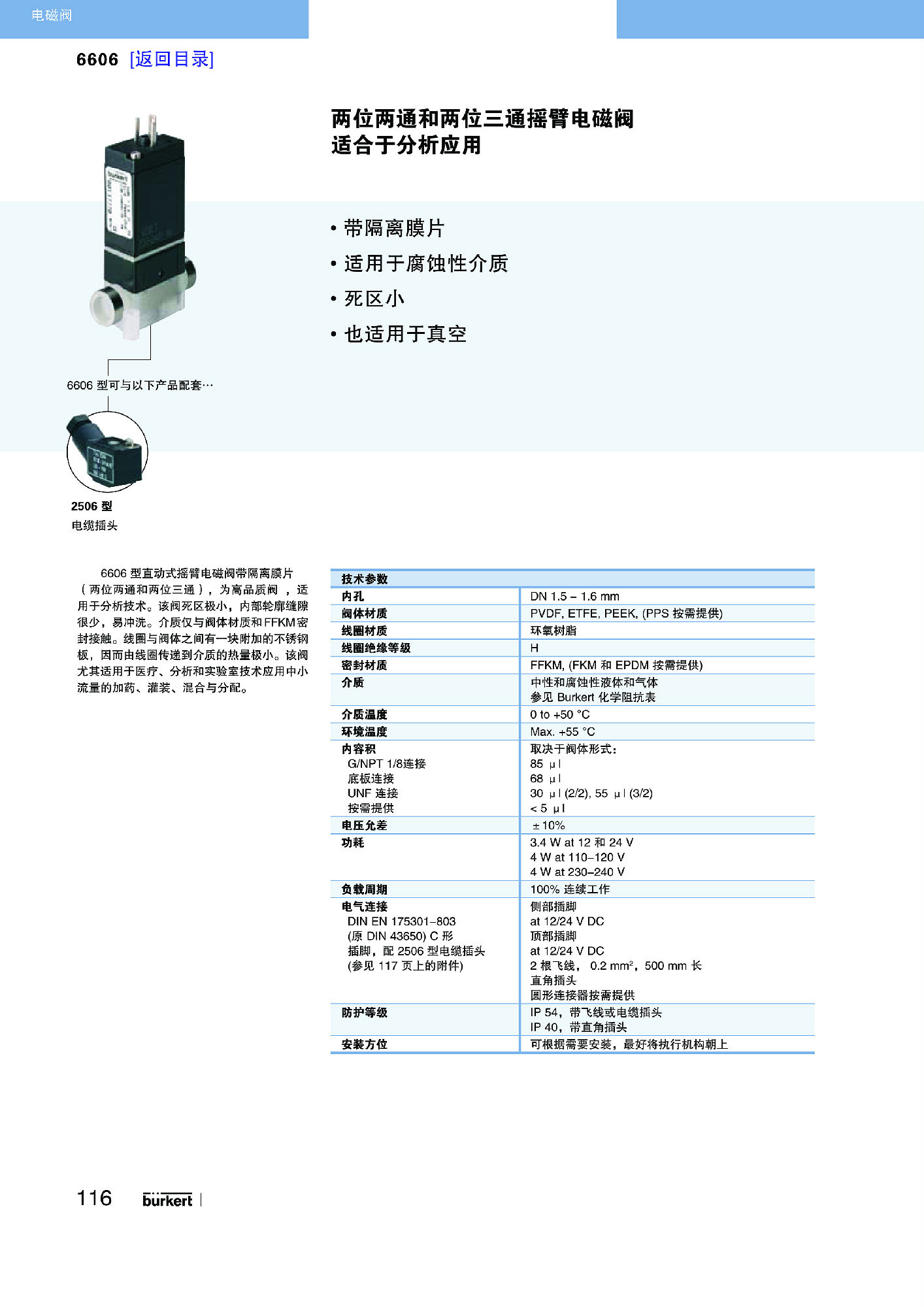 直动式摇臂电磁阀 6606(二位二通和二位三通)满足分析技术领域的最高要求。它们具有最小的死角体积和一个无间隙、易于冲洗的内部轮廓。介质只能与外壳材料和 FFKM 密封件相接触。注入到介质中的热量控制在最少,因为已通过一块不锈钢板将外壳与线圈分离。阀门主要用于分析、医药和试验室技术领域中少量介质的计量、灌注、混合和分配。