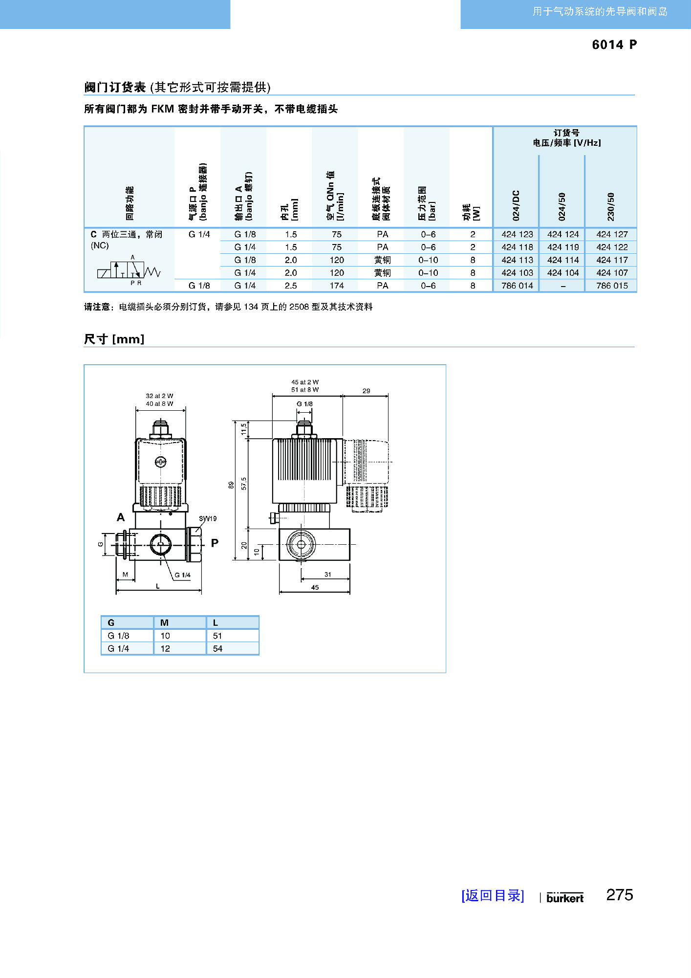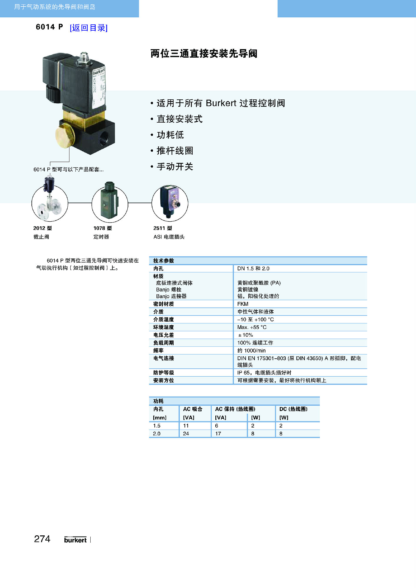 6014为直动式柱塞电磁阀。止动器与柱塞导管焊接在一起,以提高耐压性和密封性。根据不同的应用,可以选择各种密封材质。Bürkert专用底板接口使该阀可组合安装在底板上,节省空间。电磁线圈采用聚酰胺或耐化学腐蚀的环氧树脂封装。具有脉冲线圈式,用以降低功耗。可选带手动开关式,用于快速调试和方便维护。与 DIN EN 17301-803 A 型电缆插头配套,该阀的安全防护等级为 IP65,不锈钢阀体式 NEMA 4X。