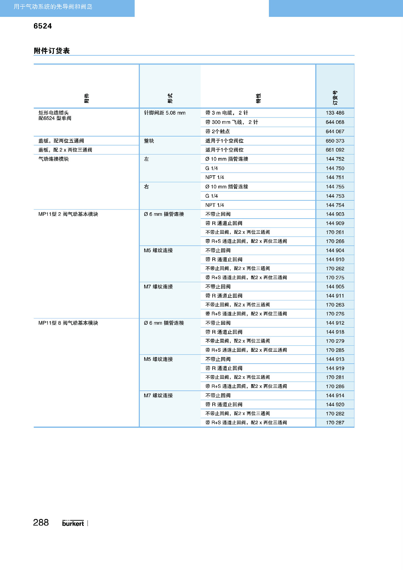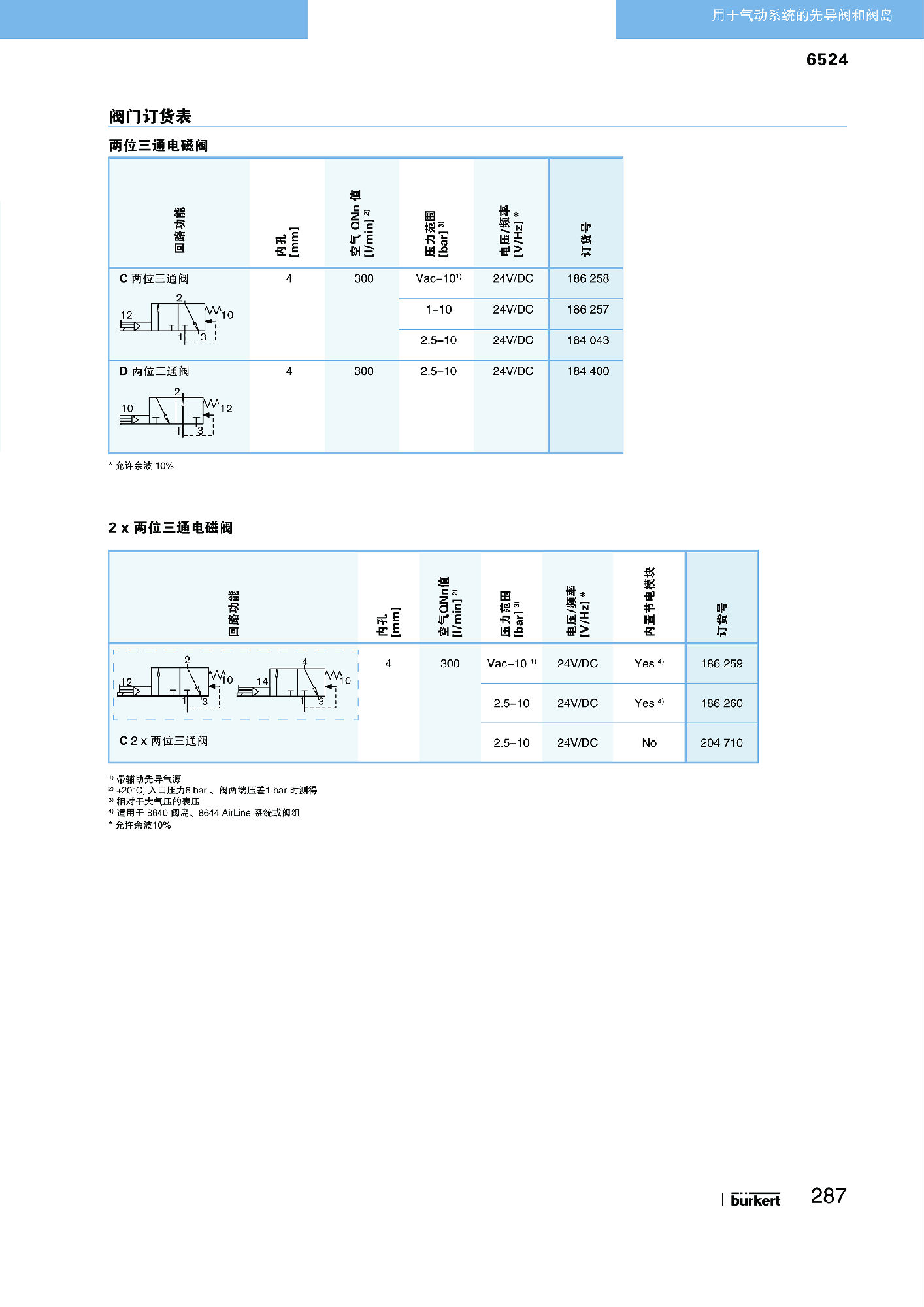 型号 6524 由一个先导式弹球电磁阀型号 6144 和一个气动提升阀组成。该弹球作用系统能够以更少的功率消耗在短时间内切换至高压。所有阀门均默认装配有手动紧急操作装置。2 个两位三通阀涉及两个先导式弹球电磁阀型号 6144 和一个气动提升阀的组合。阀门也装配有第 2 个接口(压下的电缆),借此可实现安全相关的切断功能。