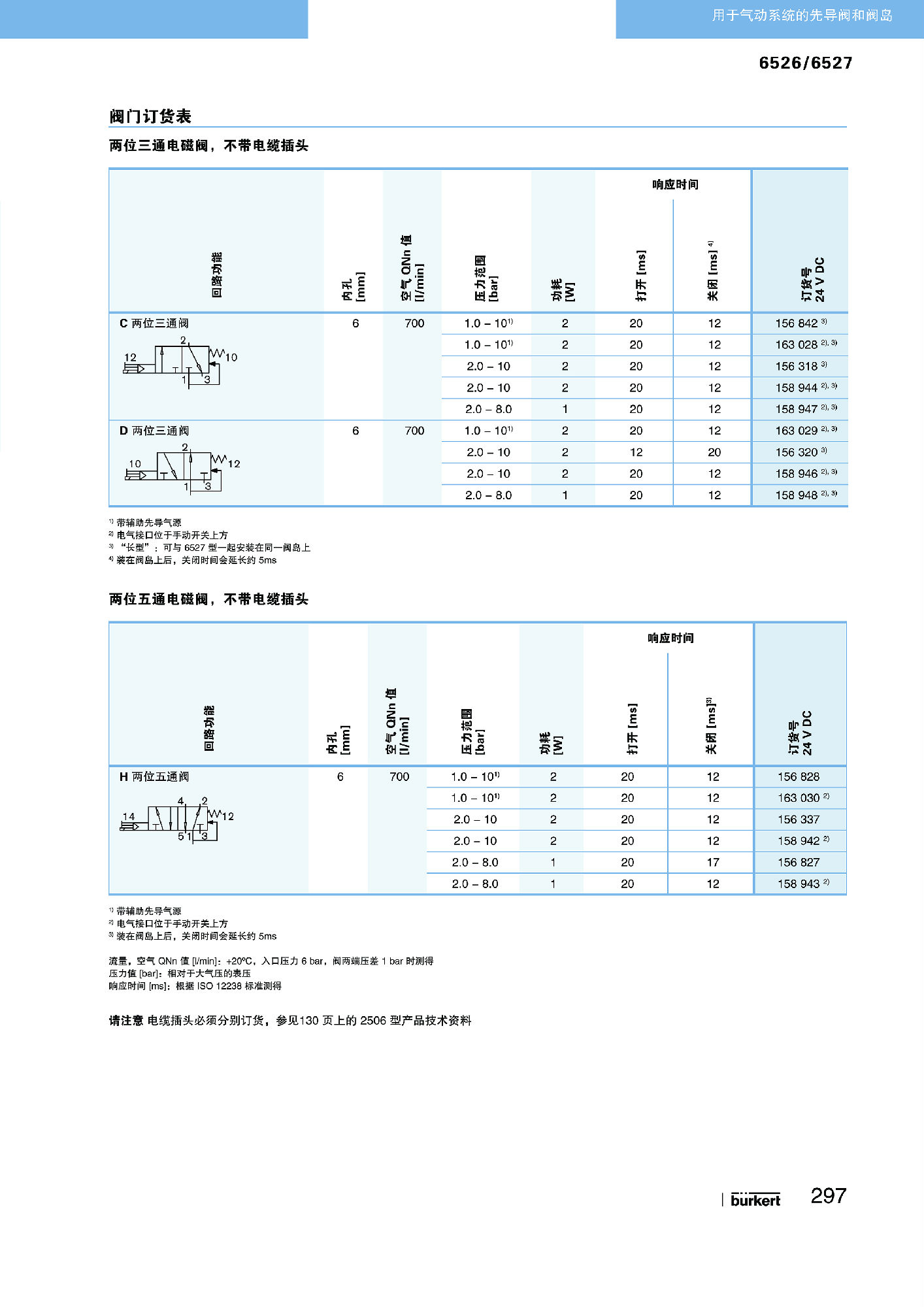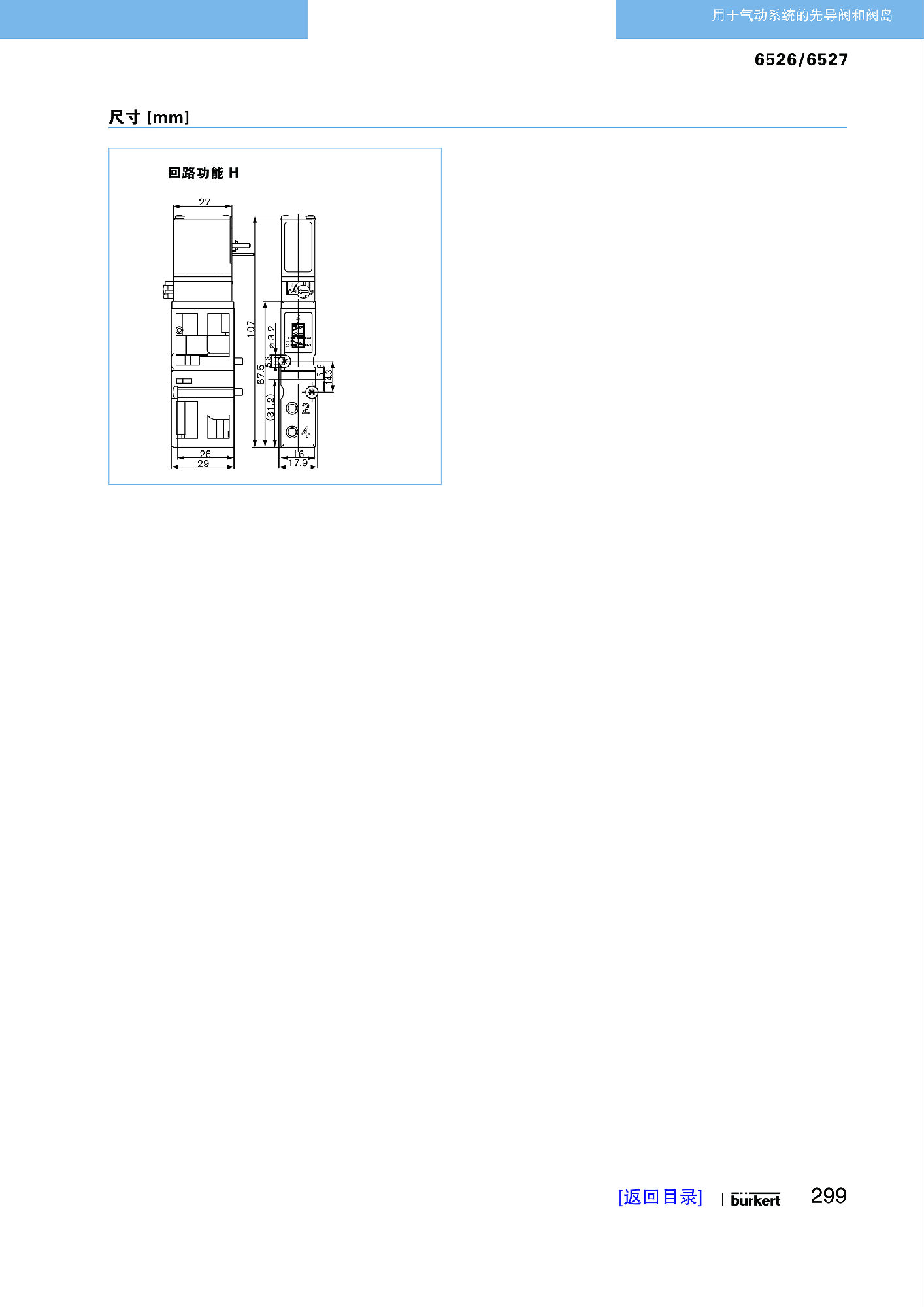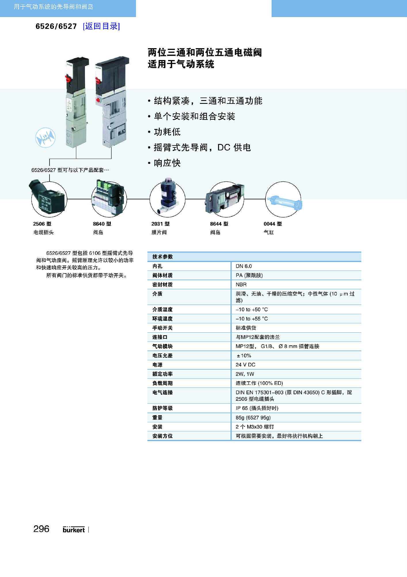 6526 型阀门由一个 6106 型先导式摇臂电磁阀和一个气动阀构成。该作用原理允许在功率消耗很小的情况下接通高压,且开关时间短。阀门是可串接的,带有向后主要连接阀岛(型号 8640 或 8644)以及向前主要连接阀块的插头接口,用于控制气动驱动装置批量型先导阀装配了一个手动操作装置。
