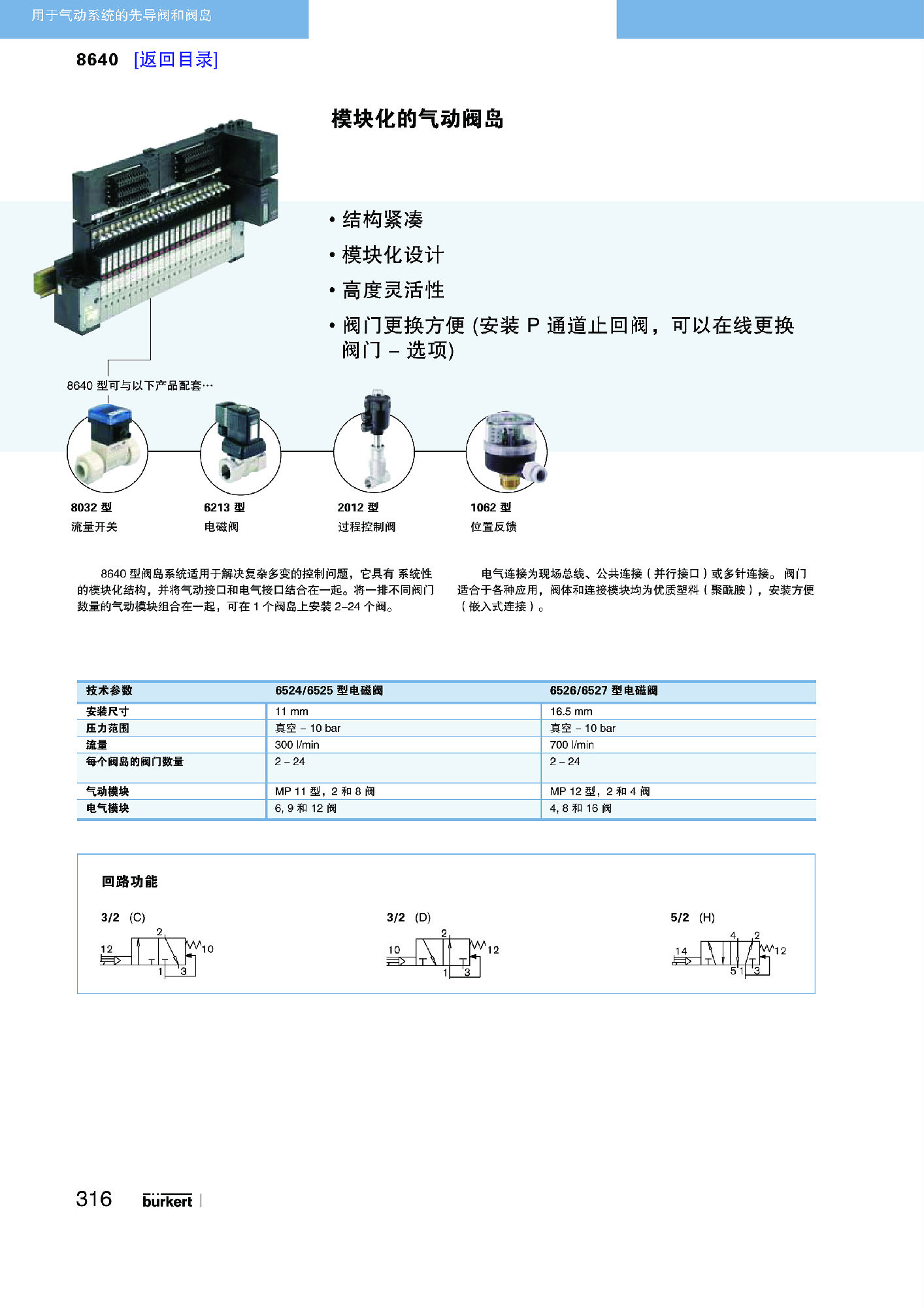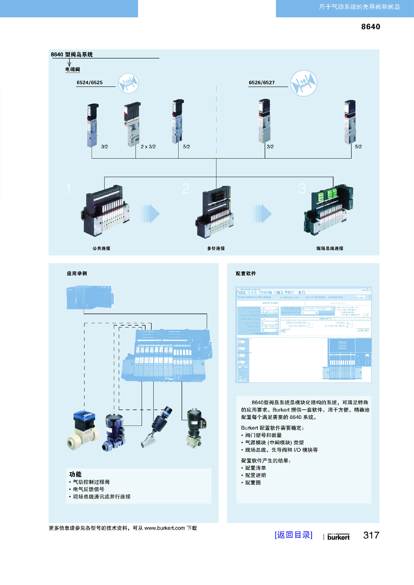 8640 型阀岛系统的气动和电气接口具有一致的模块化结构,适合解决多样化的复杂控制任务。通过串接具有不同阀门数目的气动模块,可以在一个阀岛上实现 2 到 24 种阀门功能。可选择通过现场总线接口、汇流接口(并联技术)或多极接口进行电气连接。该种阀门允许不同的使用可能性。外壳和连接模块由高品质的塑料(聚酰胺)制造而成,可通过集成式卡合技术简单地连接或松脱。