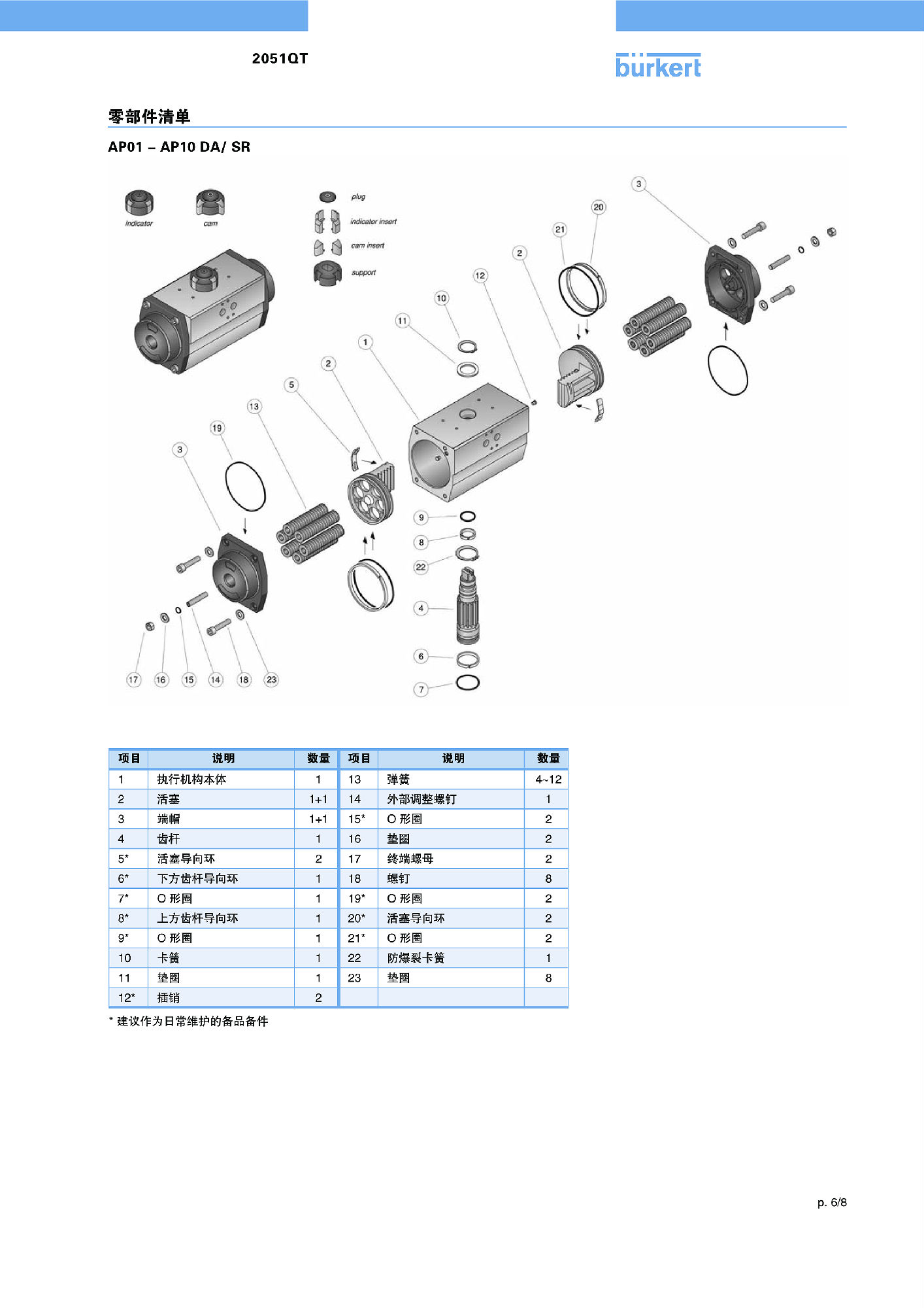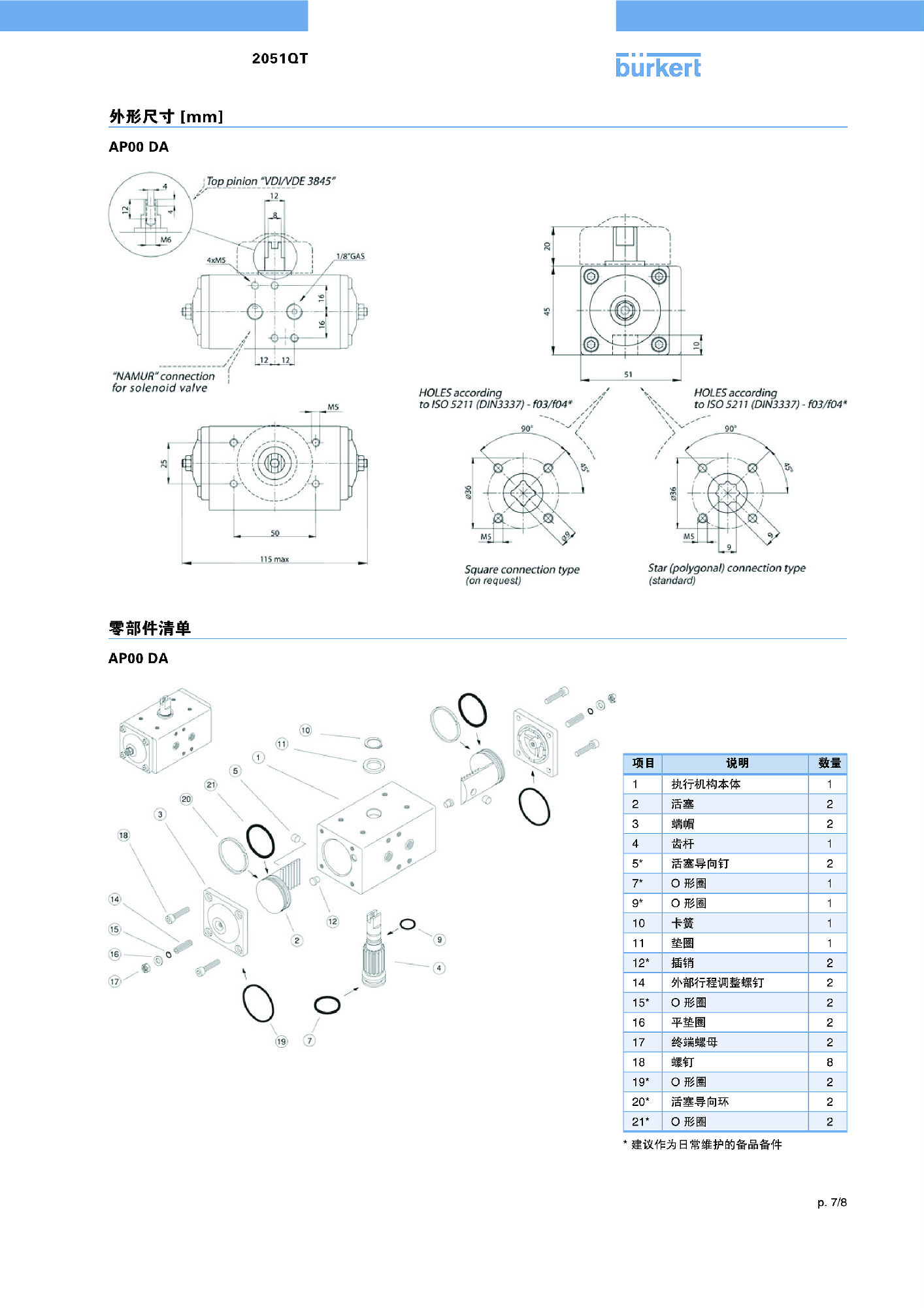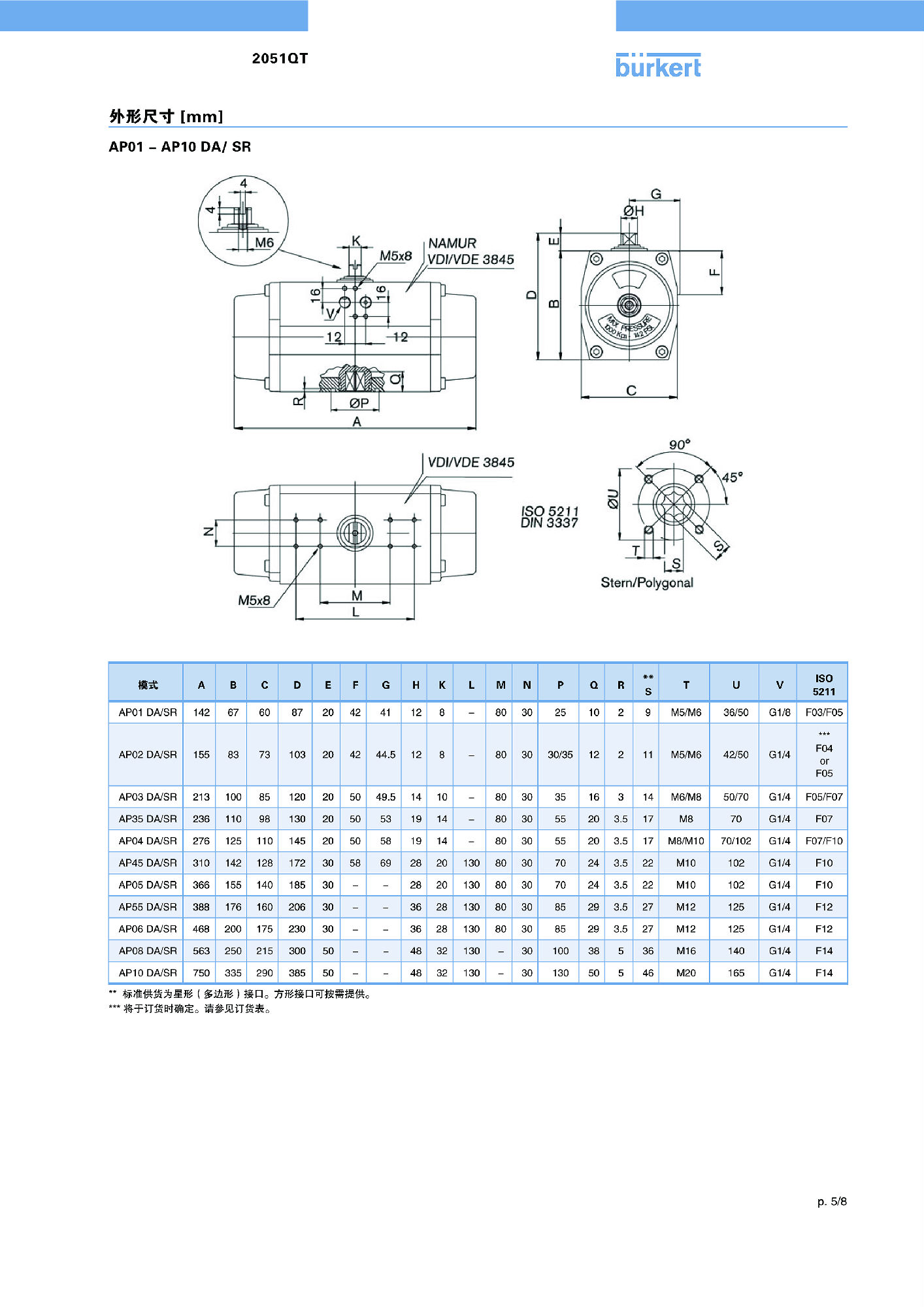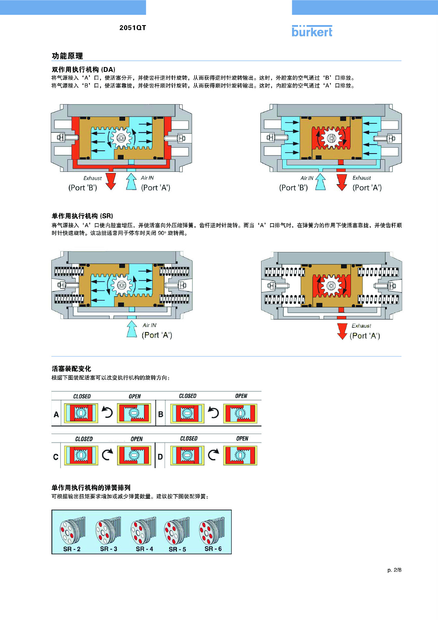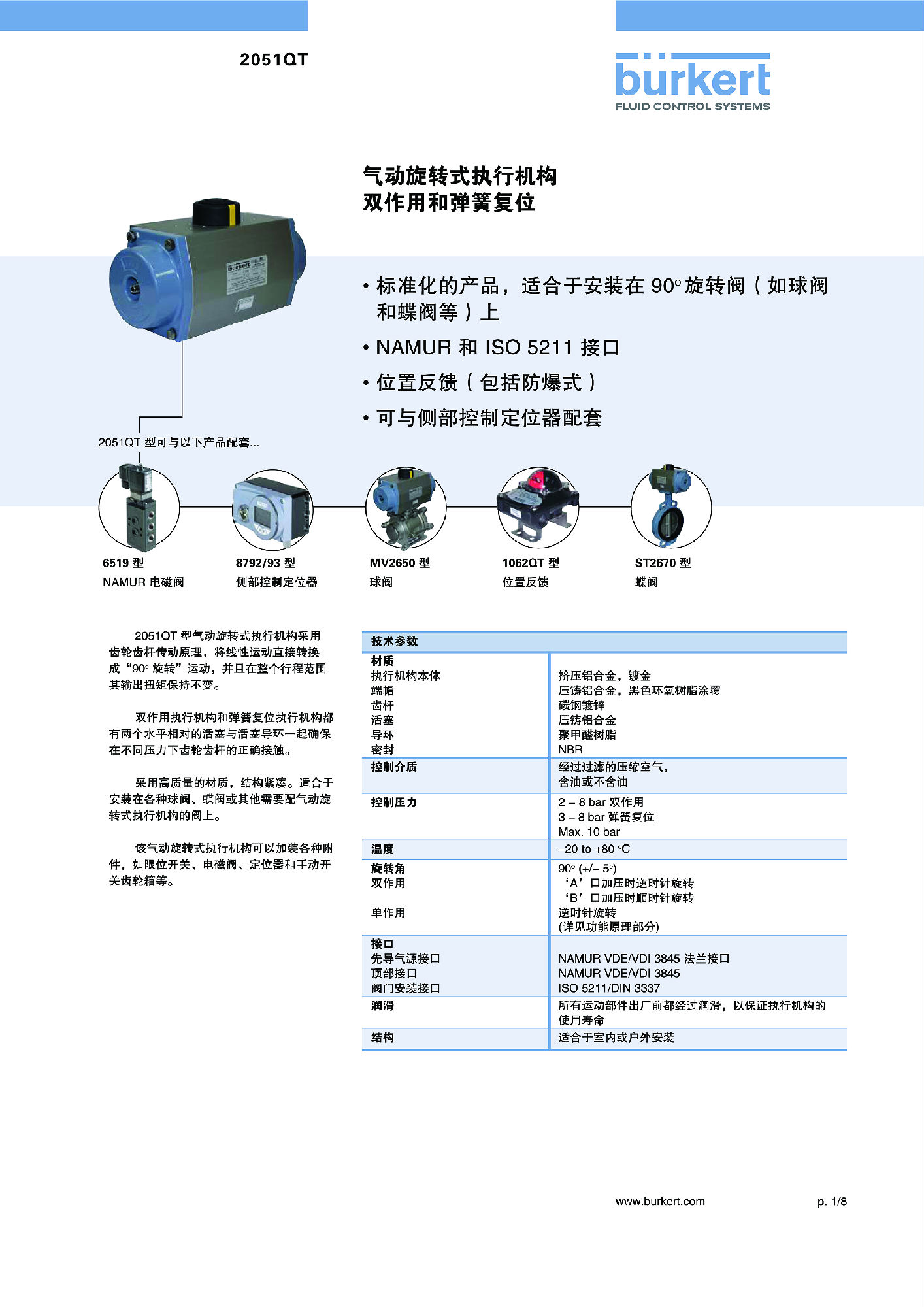 气动摆动驱动装置 2051,由一个单作用或双作用的气动线性活塞驱动装置构成,具有一个用于连接旋转件的内部联轴器以及一个符合 ISO 5211 的通用机械接口。当活塞在控制空气的压力作用下或复位弹簧的弹力作用下做线性运动时,驱动轴会在联轴器的作用下旋转 90°。该旋转运动可用于操作相应的调整元件,比如球阀、活瓣等。驱动装置具有一个用于显示旋转位置的光学指示器。驱动装置免维护。