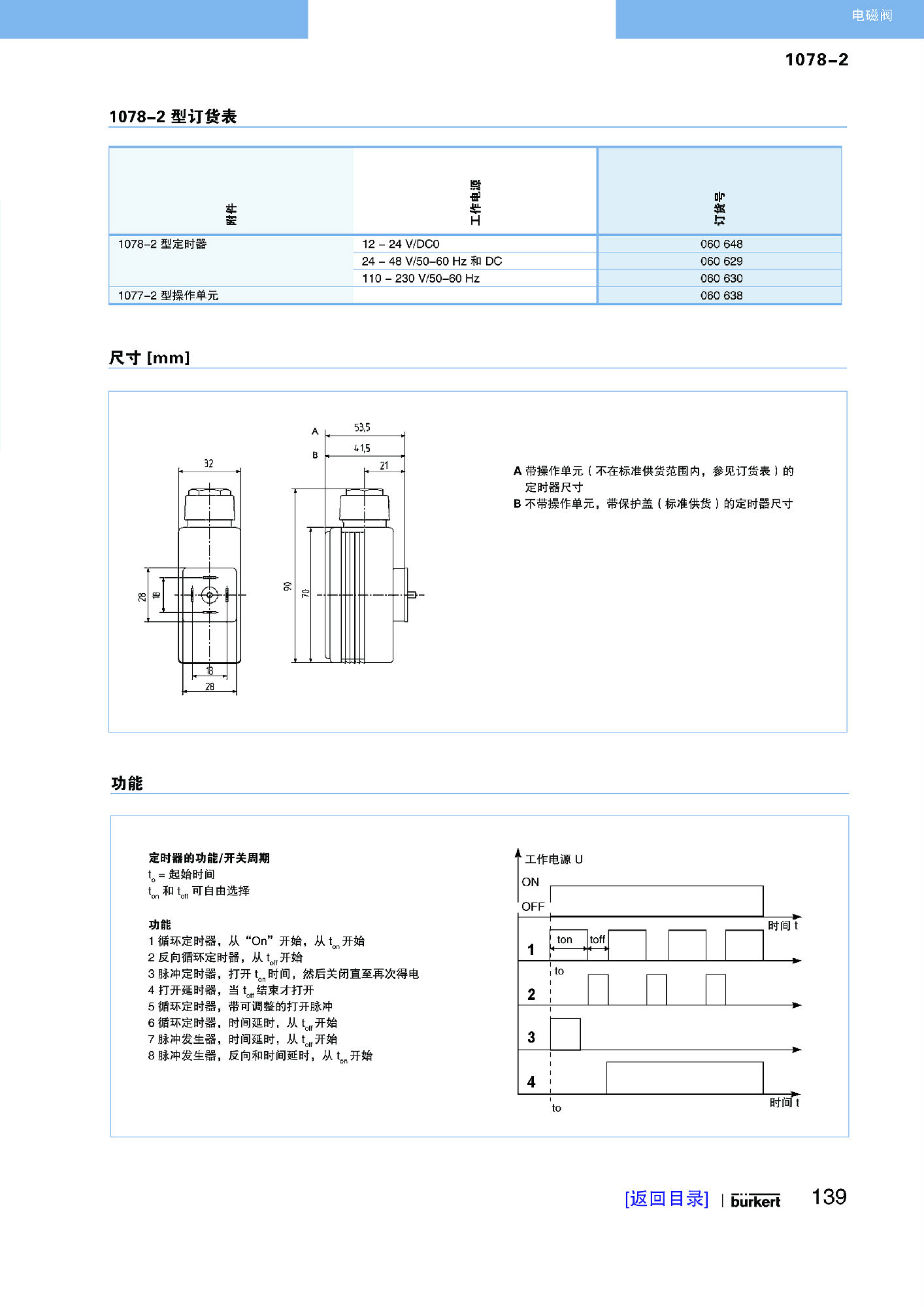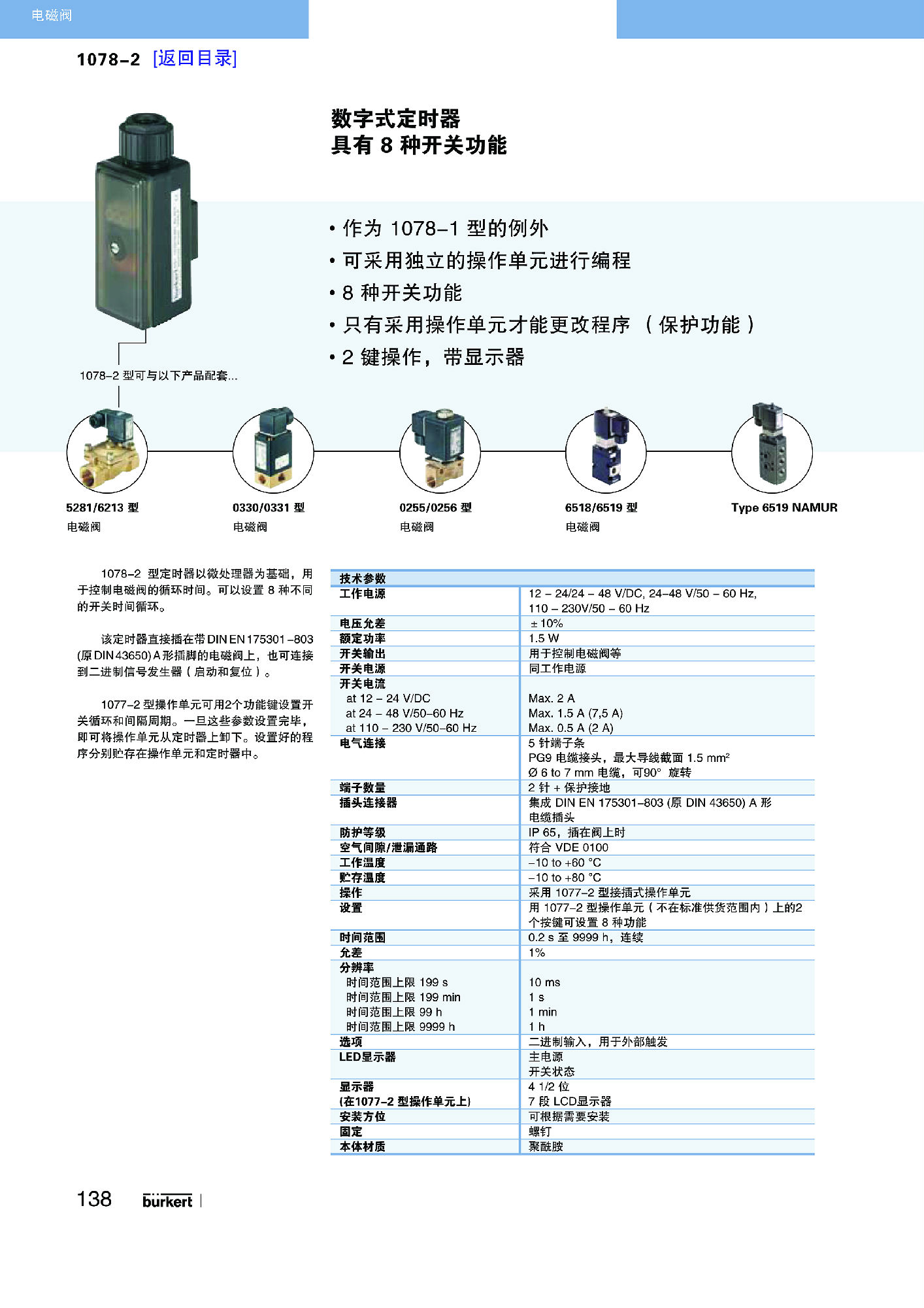型号 1078-1 工作时以一个微处理器为基础,可用来控制电磁阀的开关时间。可以设置的开关时间周期有四种。控制装置利用一个符合 DIN EN 175301-803(以前是 DIN 43650)的 A 型设备插座插在电磁阀的插接位置。程序设置和开关时间可借助 DIP 开关和电位计完成。现有电源电压和开关状态由 2 个 LED 显示。