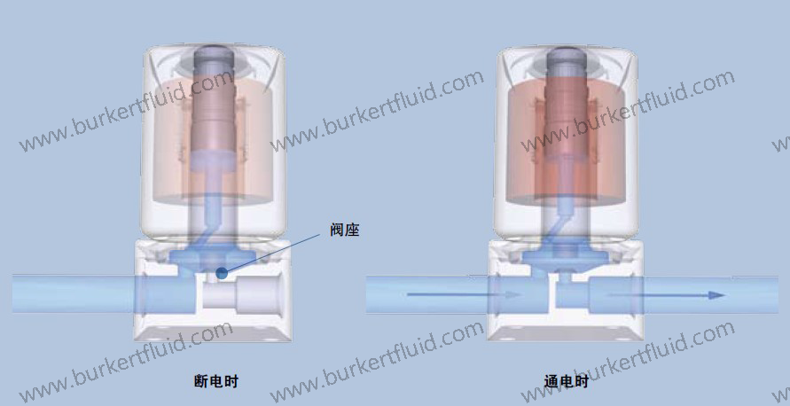 线圈断电时,铁芯弹簧借助于介质压力将柱塞及密封推向阀座,关闭从入口至出口的通路。通电时,电磁线圈产生足够大的磁力克服弹簧力和介质压力将柱塞向上提起,打开入口至出口的通路使流体流过。