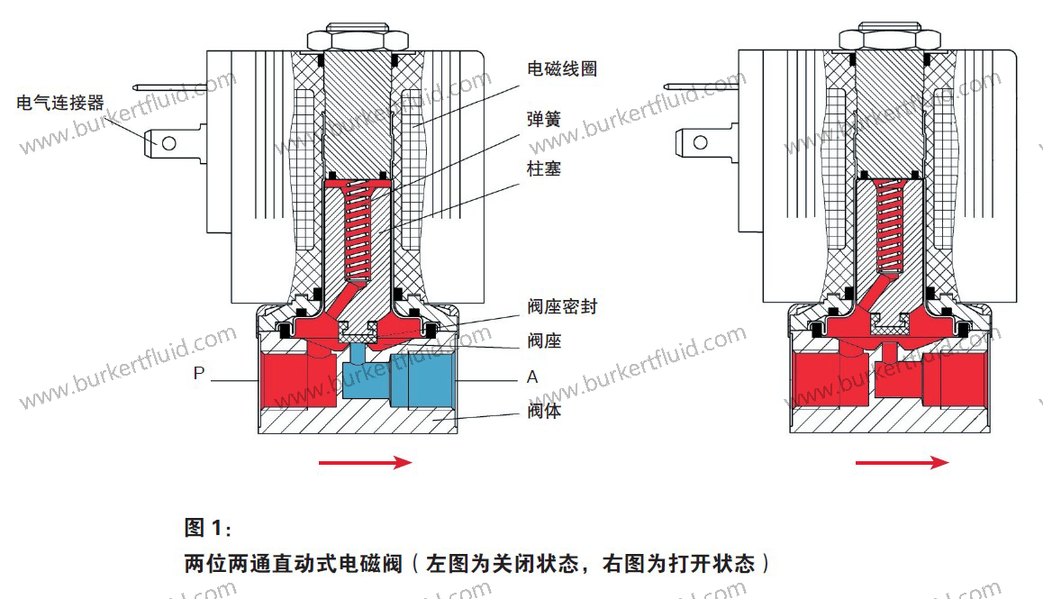 流向通常为阀座上。直动式柱塞电磁阀具有常开和常闭功能。