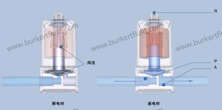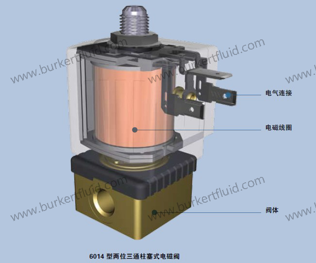 两位三通直动式电磁阀(如:6012型和6014型)有三个接口和两个阀座,其中的一个阀座始终处于打开状态或关闭状态。