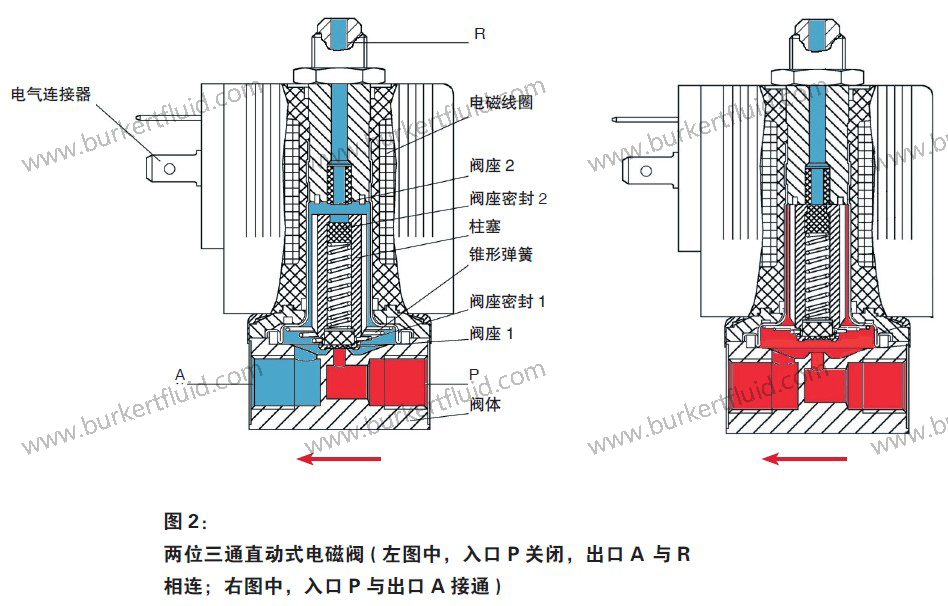阀门功能取决于接口是如何与流体系统连接的。对于常闭型,接口P(见图2)与带压流体相连;接口A为出口;接口R是返回口或排气口。断电时,锥形弹簧会把衔铁(柱塞)推向阀座1,并将接口P封住。此时,接口A与接口R相连。通电后,在磁力的作用下衔铁被提起,于是阀座2和接口R都被封住了。当柱塞向上移动的时候,阀座1被打开,于是流体就可以从P流到A了。对于常开型,接口R常闭。