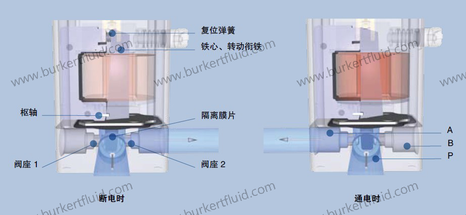 该阀是通过线圈感应,使铁心围绕进行横向或旋转运动来进行开关的。这样,铁心能够封闭横向排列的两个阀座之一。与柱塞式电磁阀比较,转动衔铁电磁阀可采用隔离膜片,也就是说,该阀可用于控制污垢或者腐蚀性介质,也可用于真空。