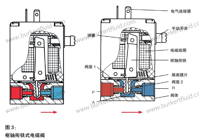 枢轴衔铁式电磁阀有两位两通和两位三通两种。宝帝两位三通枢轴衔铁式电磁阀(如:0330型,见图3)中有一块隔离膜片,可以防止流体进入衔铁室。这种电磁阀带手动开关(标准配置)。如果用户需要,还可以在电磁阀上安装位置指示器或反馈指示器。