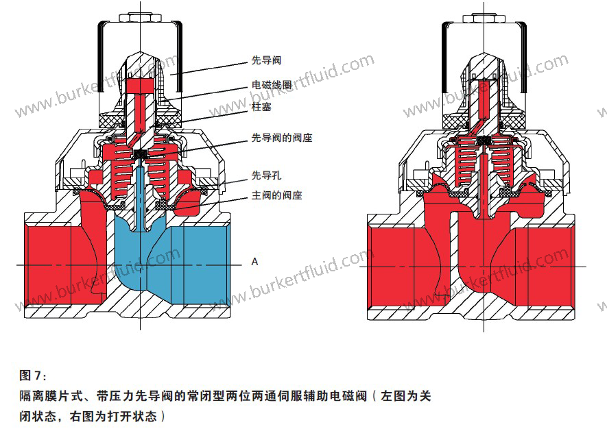 这种电磁阀与一般的伺服辅助电磁阀有很大的不同,它的联轴器上有时还有弹簧。压差比较小的时候,直动式功能起主要作用。压差比较大的时候,伺服辅助功能起主要作用。优点:■ 没有压差时阀门也能打开,适用于低压流体系统■ 关闭时的冲击力小■ 性能价格比非常好■ 用途广泛缺点:■ 膜片上的先导孔比较小,所以对脏的介质相当敏感■ 只有常闭型■ 口径较大时,需要使用高功率的线圈