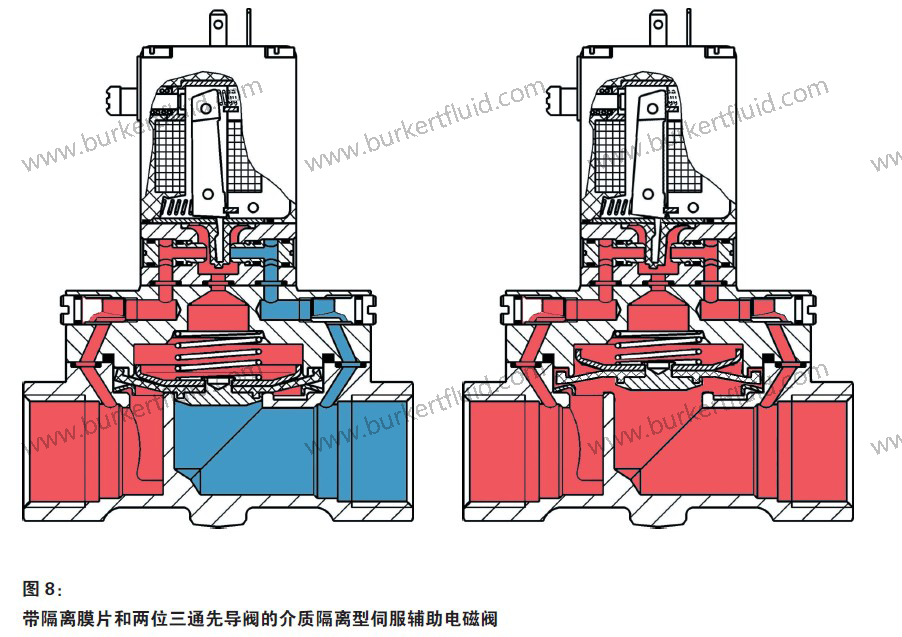其先导阀为带隔离膜片的枢轴衔铁式电磁阀或摇臂式电磁阀。与两通先导阀的主要区别是:当阀门打开时,介质并不经过先导阀,所以先导孔不容易堵塞,而且膜片对衔铁还有保护作用。这种阀门(如:142型和5282型)主要适用于比较脏污的介质和腐蚀性介质。优点:■ 膜片上没有先导孔,所以对脏污的介质不敏感■ 膜片对衔铁有保护作用■ 阀门打开或关闭时,只有很少量的介质进入先导阀■ 阀门打开状态下,没有介质进入先导阀!这是这种阀门的最大优点■ 利用调节螺丝可以调节响应时间图8:带隔离膜片和两位三通先导阀的介质隔离型伺服辅助电磁阀■ 旋转先导阀,可以将常闭型变为常开型,反之亦然■ 可靠性很高■ 可提供防爆型缺点:■ 价格比较贵■ 阀门打开时需要压差,所以不是对所有流体系统都适用
