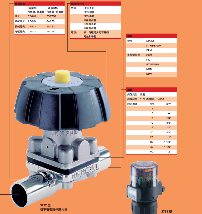 2031/3233型铸不锈钢阀体膜片阀在灌装和加药过程中尽显其优越性,广泛应用于食品行业、化学工业和工艺过程中。铸不锈钢阀体适用于高纯介质、腐蚀性和磨蚀性介质。带气动执行机构的2731型膜片调节阀,具有铸不锈钢阀体的所有特性。其执行机构的行程可以连续变化,因而可获得最佳的连续流量变化特性。膜片阀由连续式顶部控制器控制,该控制器也可用作带PID功能的过程控制器。