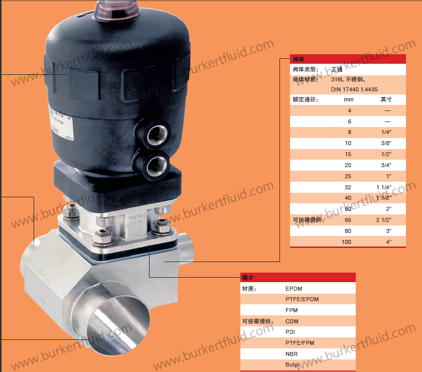 不锈钢阀体T形阀适用于高纯介质的分配和集合2032/3234型不锈钢阀体上没有焊缝,可满足制药行业和食品行业的要求,适用于高纯介质和无菌介质。