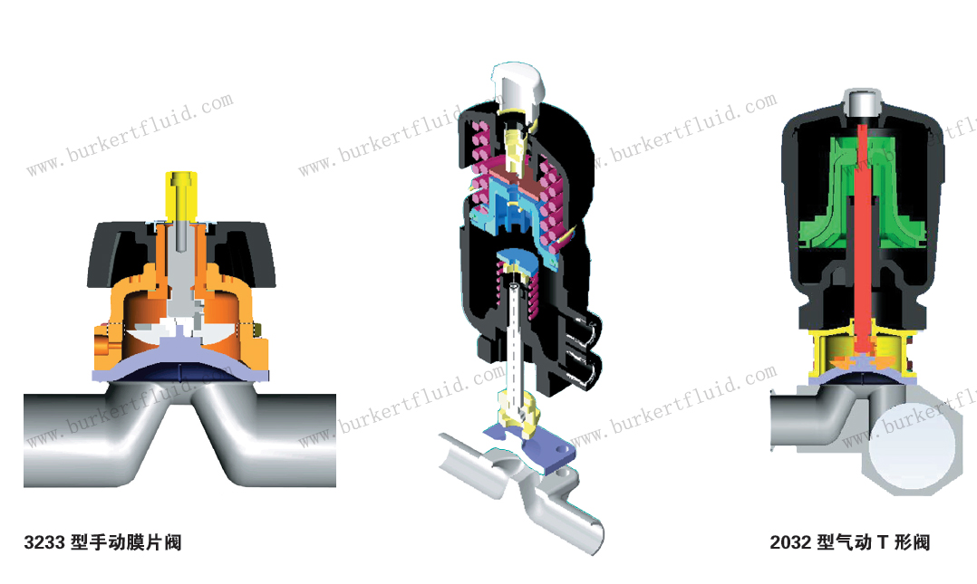膜片阀的执行机构采用最先进的设计,材质为PA(聚酰胺)或PPS(聚苯硫醚),带位置指示器,控制功能可转换。材质为PPS和FPM(氟橡胶)的执行机构,其活塞密封可以在130℃下进行消毒。PPS执行机构的手动或气动阀,介质温度最高可达140℃(取决于密封材质)。