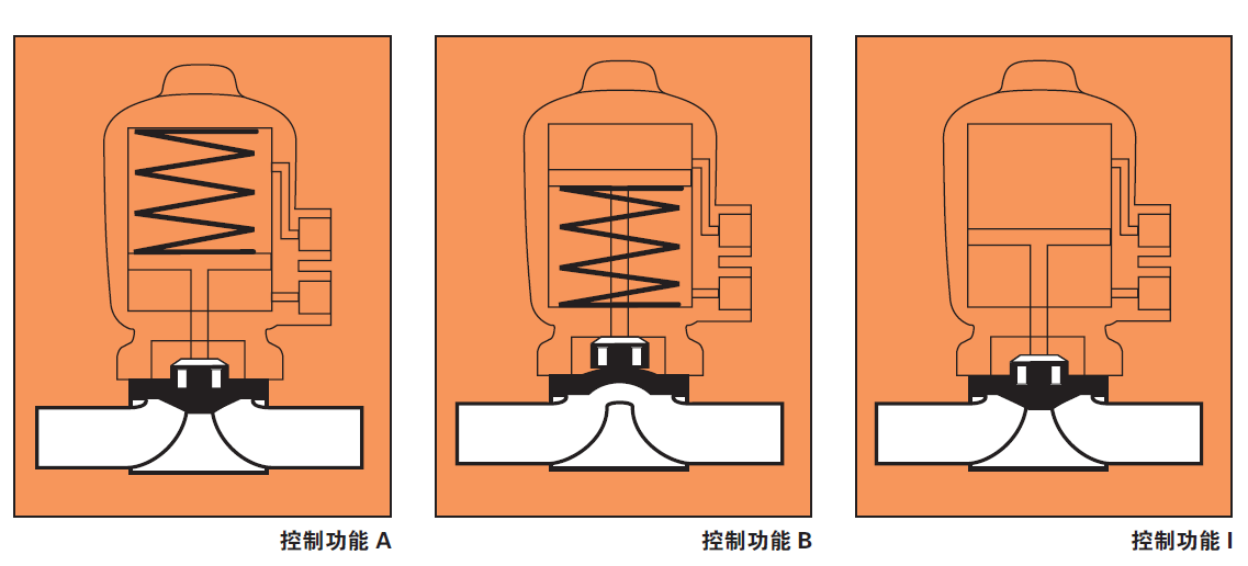 2030/2031型气动执行机构气动执行机构有单作用和双作用两种,可实现以下控制功能:A:两位两通阀,弹簧作用常闭型B: 两位两通阀,弹簧作用常开型I: 两位两通阀,双作用