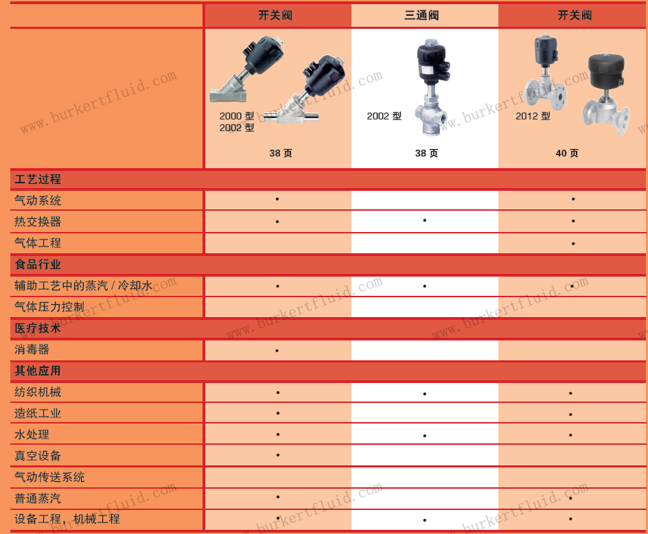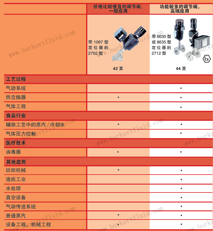 开关阀,调节阀使用范围主要包括:工艺过程、食品行业、医疗技术、纺织机械、造纸工业、水处理、真空设备、气动传送系统、普通蒸汽、设备工程、机械工程等