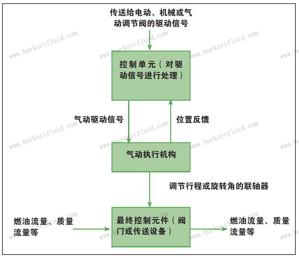 气动执行机构系统包括控制单元(通常具有转换功能),气动执行机构(气缸-活塞式执行机构、隔膜式执行机构或旋转式执行机构)和最终控制元件(阀门或传动装置)以及各种附件。控制单元由低能量输入信号(如:带气动输出/驱动信号的电动、气动、机械调节阀等)驱动。与执行机构相连的最终控制元件则由行程、旋转角或力驱动,直接对过程参数(燃油流量、质量流量等)进行控制。
