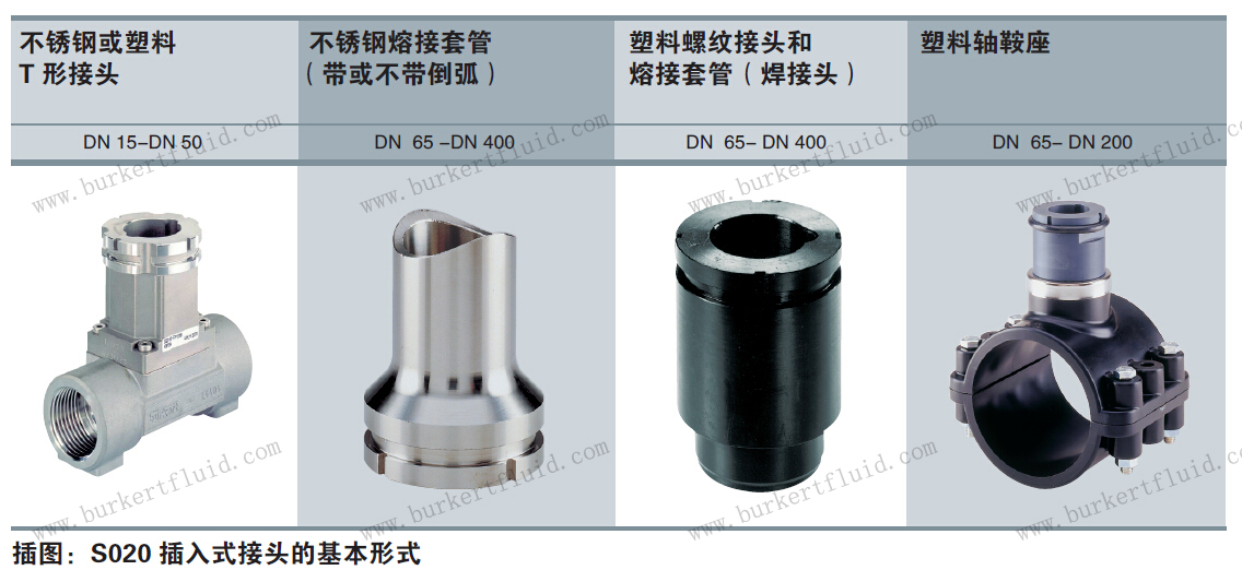S020系列插入式接头材质有塑料、黄铜或不锈钢。插入式接头包括带凹槽的接头、塑料密封圈和固定螺母。有多种连接方式(套管、外螺纹、焊接口、三夹式、法兰等等)。额定通径为65-400 mm时,最好采用塑料或不锈钢的熔接套管或塑料轴鞍座。储罐安装时最好采用焊接型(不锈钢储罐)或旋入型接头(塑料储罐)。
