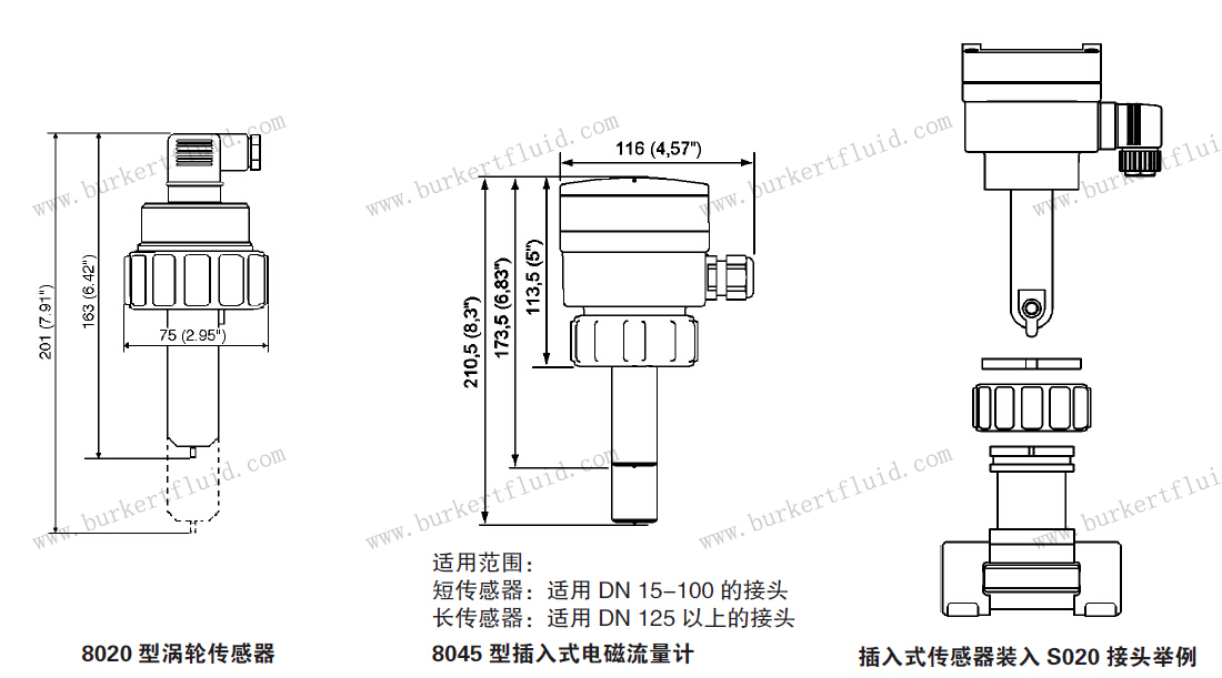 选用Burkert插入式传感器时,建议采用相应额定通径的S020型安装接头。必须选择合适的探头长度(取决于额定通径)。插入式传感器探头分为长探头和短探头两种。