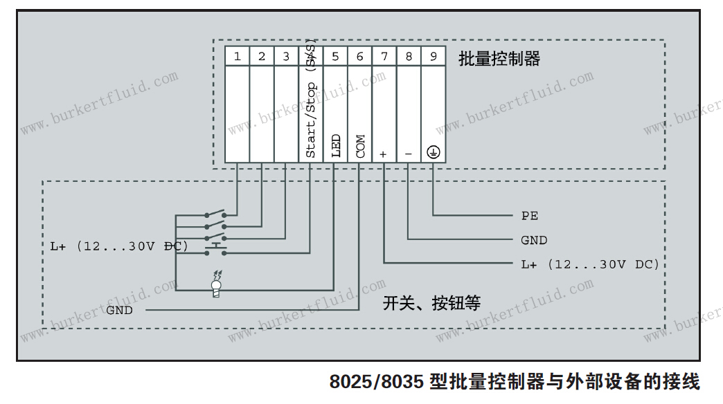 批量控制器的工作模式独立工作在现场通过按键启动批量过程。该模式中,既可通过按键输入一个批量,也可选择一个预先设置好的七个批量之一,然后再通过按键启动该批量过程。与选择开关一起工作通过旋转开关和二进制开关启动批量过程。旋转开关用于选择预先设置好的七个批量之一,而二进制开关(如:按钮)则用于启动批量过程。与外部控制器一起工作可以设置与批量控制器的二进制输入的激活时间成正比的任意批量。在控制器上对激活时间与批量的线性关系进行编程。激活该二进制输入即自动启动批量过程。批量过程中,二进制输入断开,这样就确定了该批量。